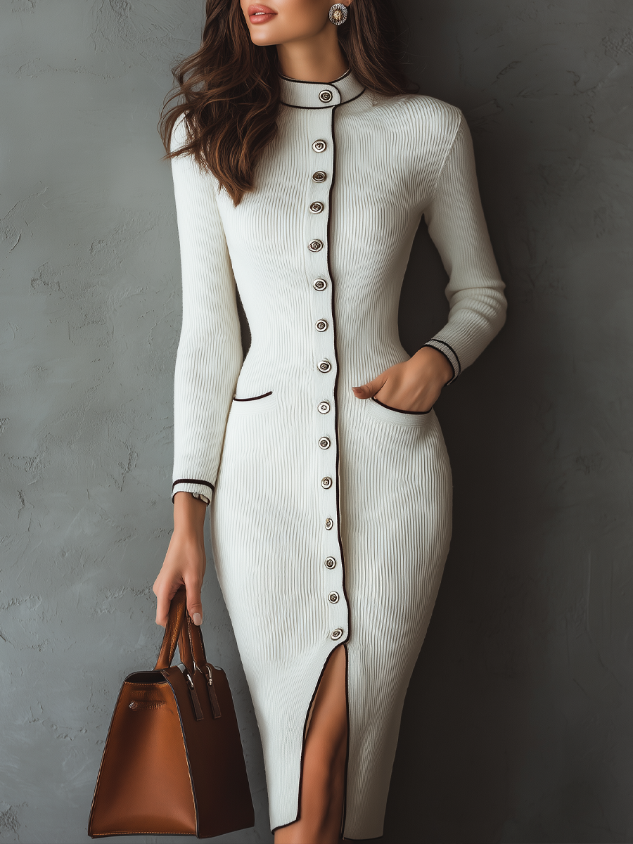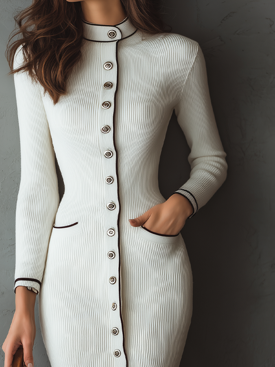 This elegant knitted midi dress features a retro stand collar and striking contrast trim, adding a touch of vintage flair to any outfit. Crafted from high-quality knitted fabric, it ensures both comfort and style for any occasion.