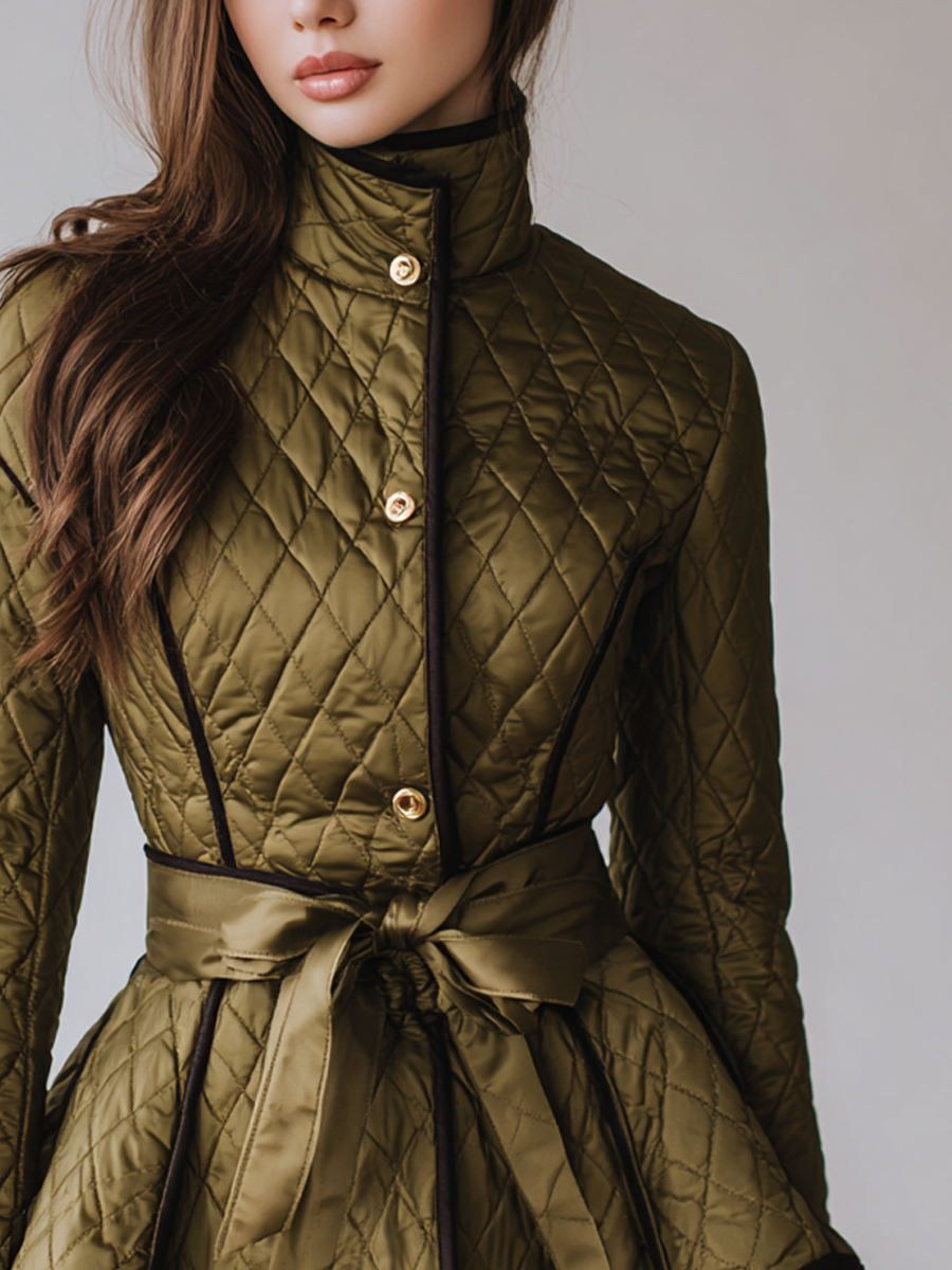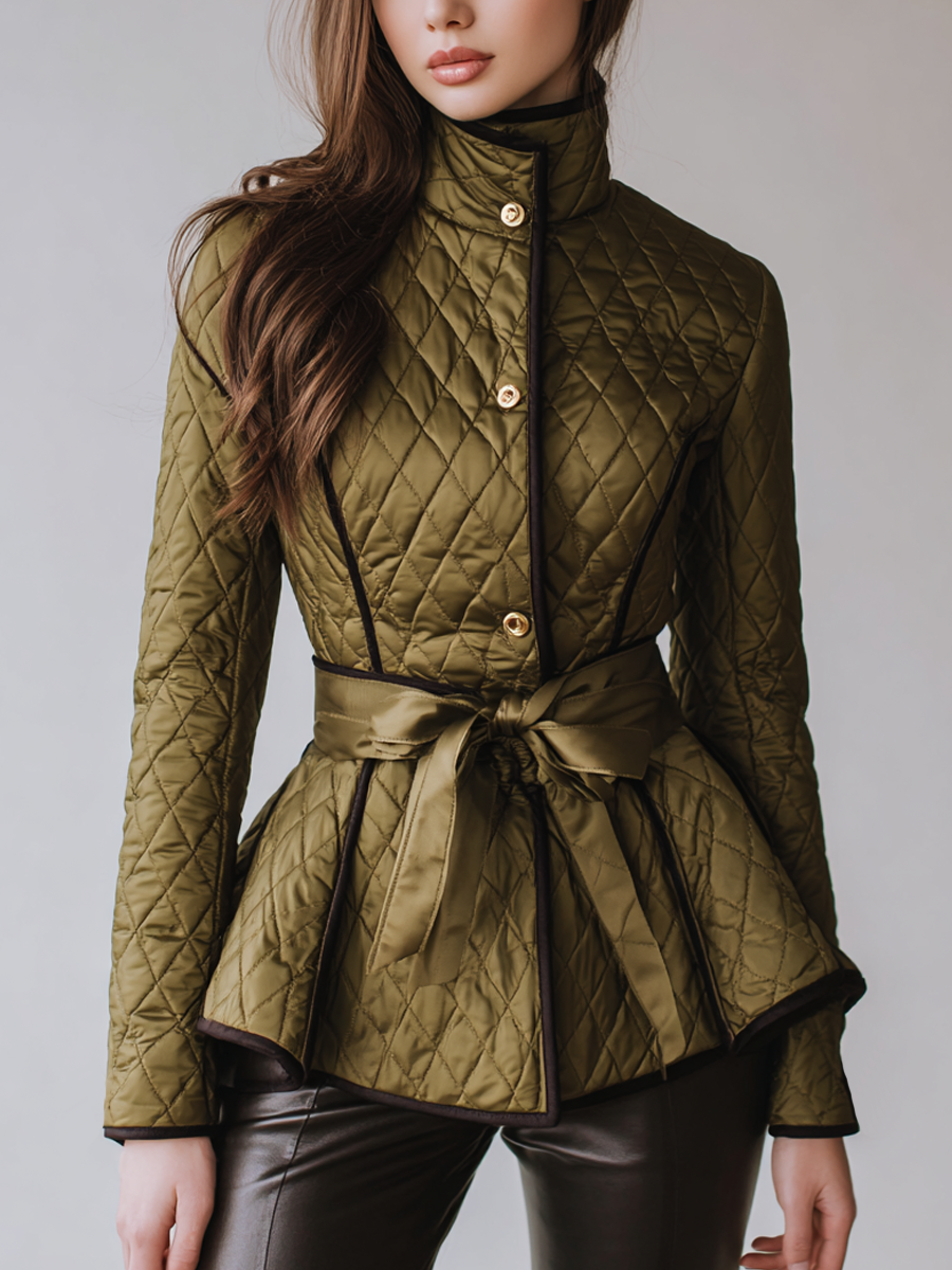 Introducing the Retro Stand Collar Ruffle Hem Quilted Jacket, a stylish blend of vintage charm and modern comfort. This jacket is designed to keep you warm and trendy with its unique quilted design and elegant ruffle hem, perfect for those who appreciate a touch of retro flair in their wardrobe.