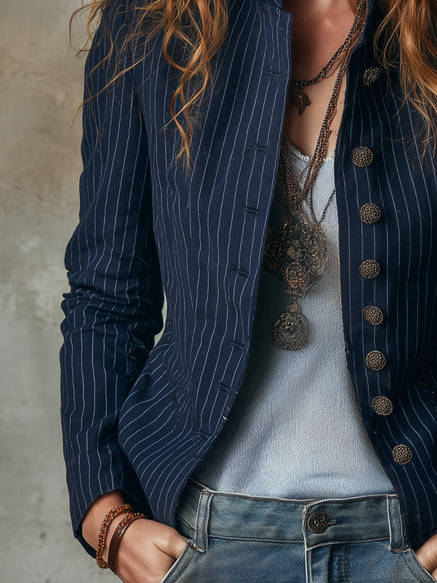 Retro Stand Collar Striped Long Sleeve Jacket