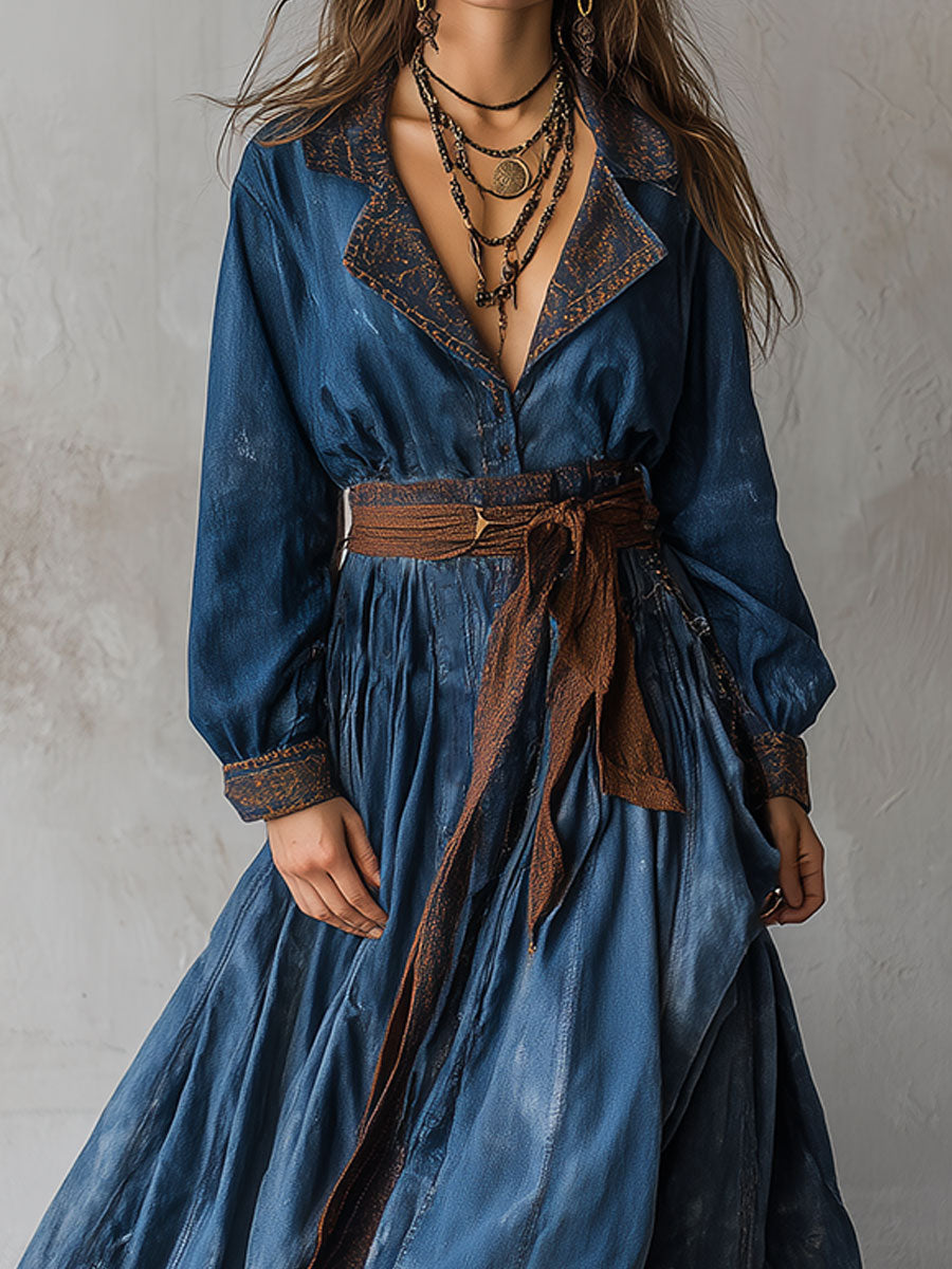 Retro Washed Printed Lapel Denim Maxi Dress