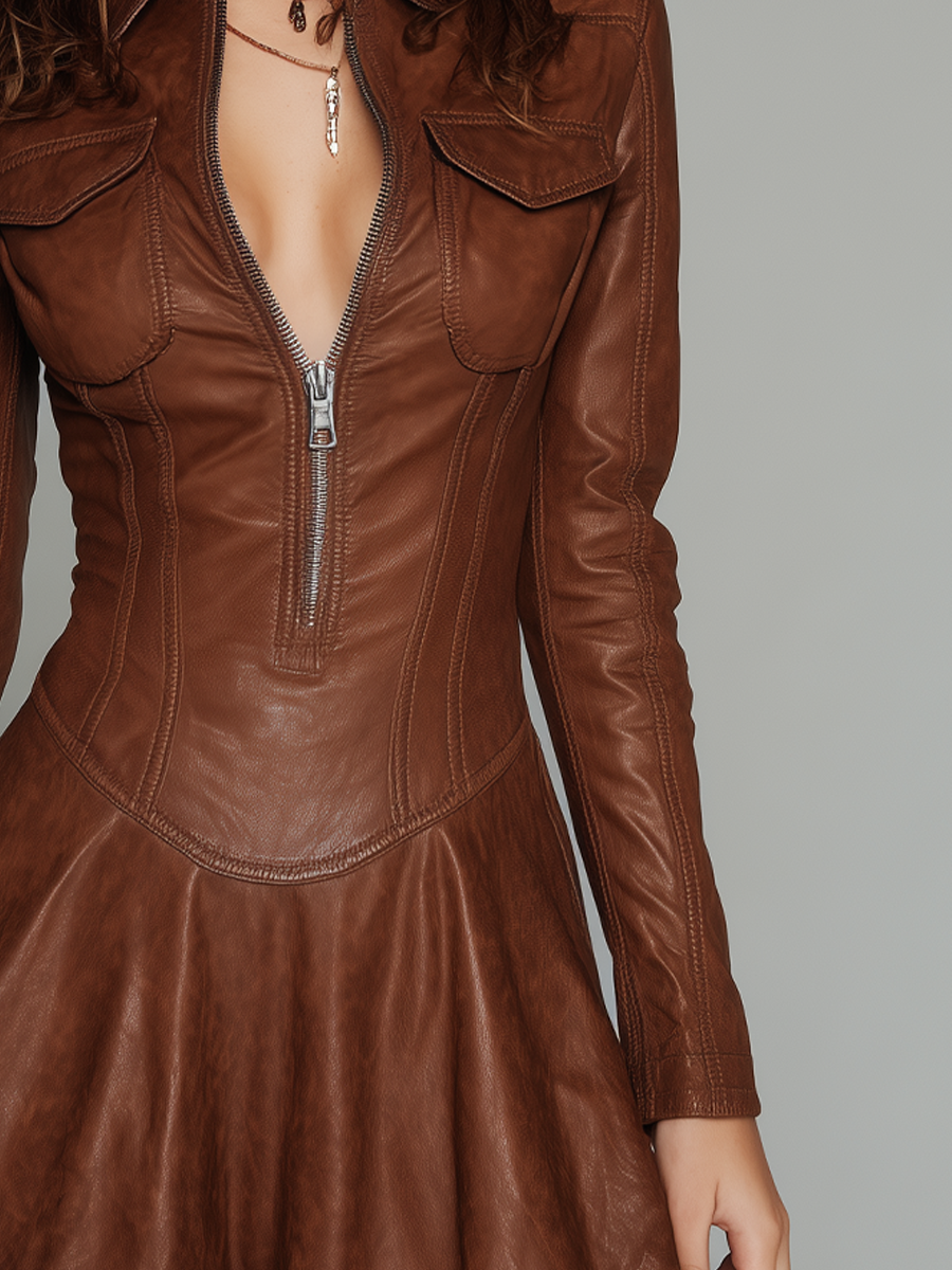This Retro Zipper Collar Flap Pocket Eco-leather Mini Dress captures the essence of vintage style with a modern twist. Crafted from high-quality eco-leather, this mini dress is both chic and sustainable, reflecting a conscientious fashion choice.