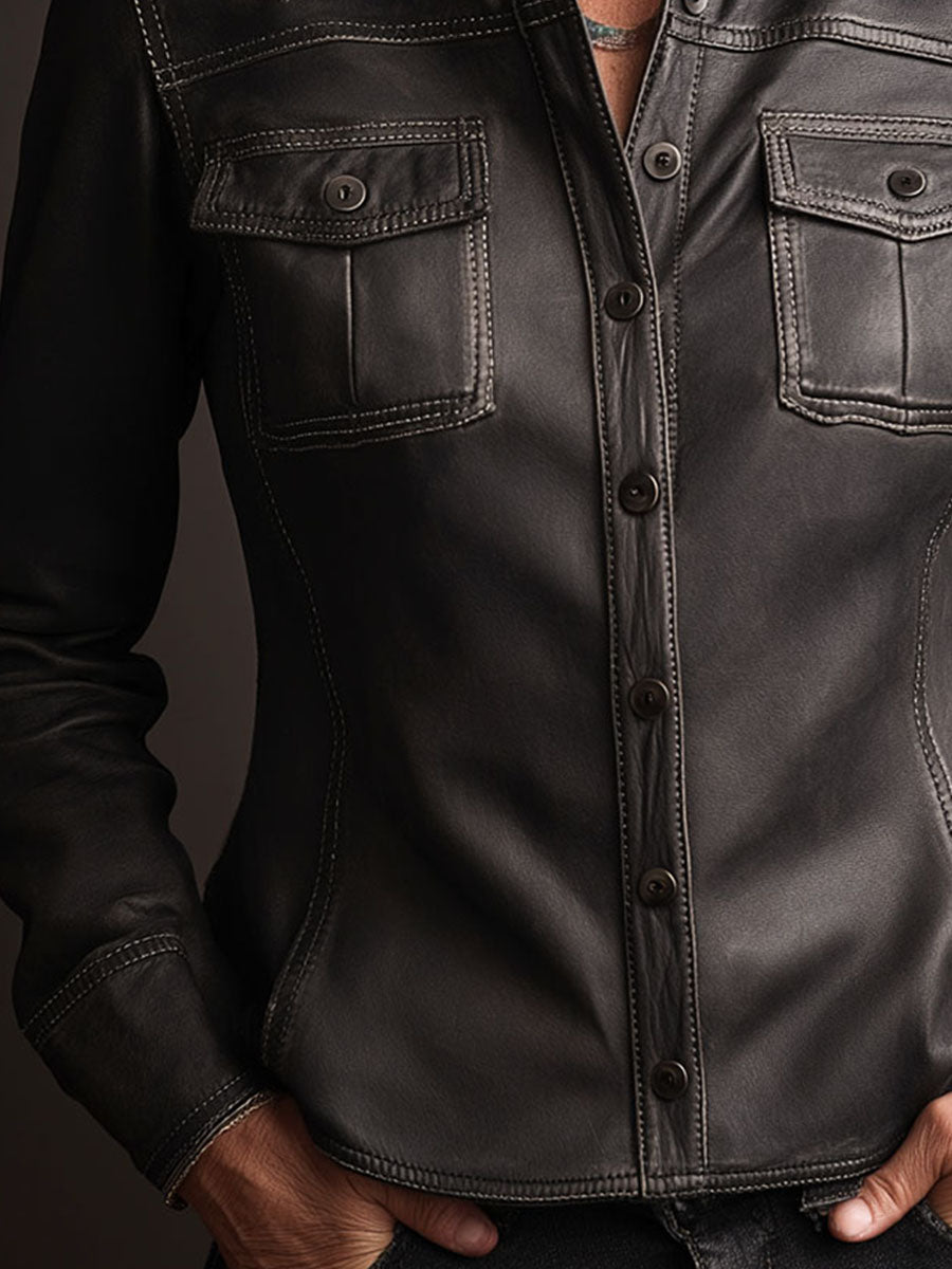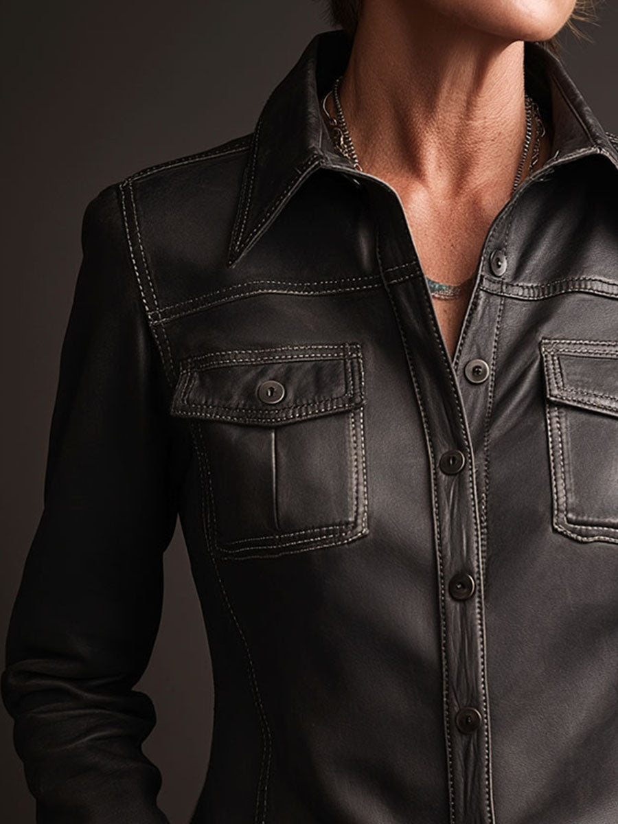 Black Eco Leather Contrast Stitching Shirt Jacket With Pockets