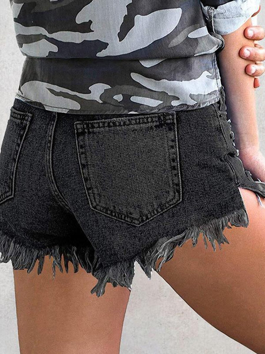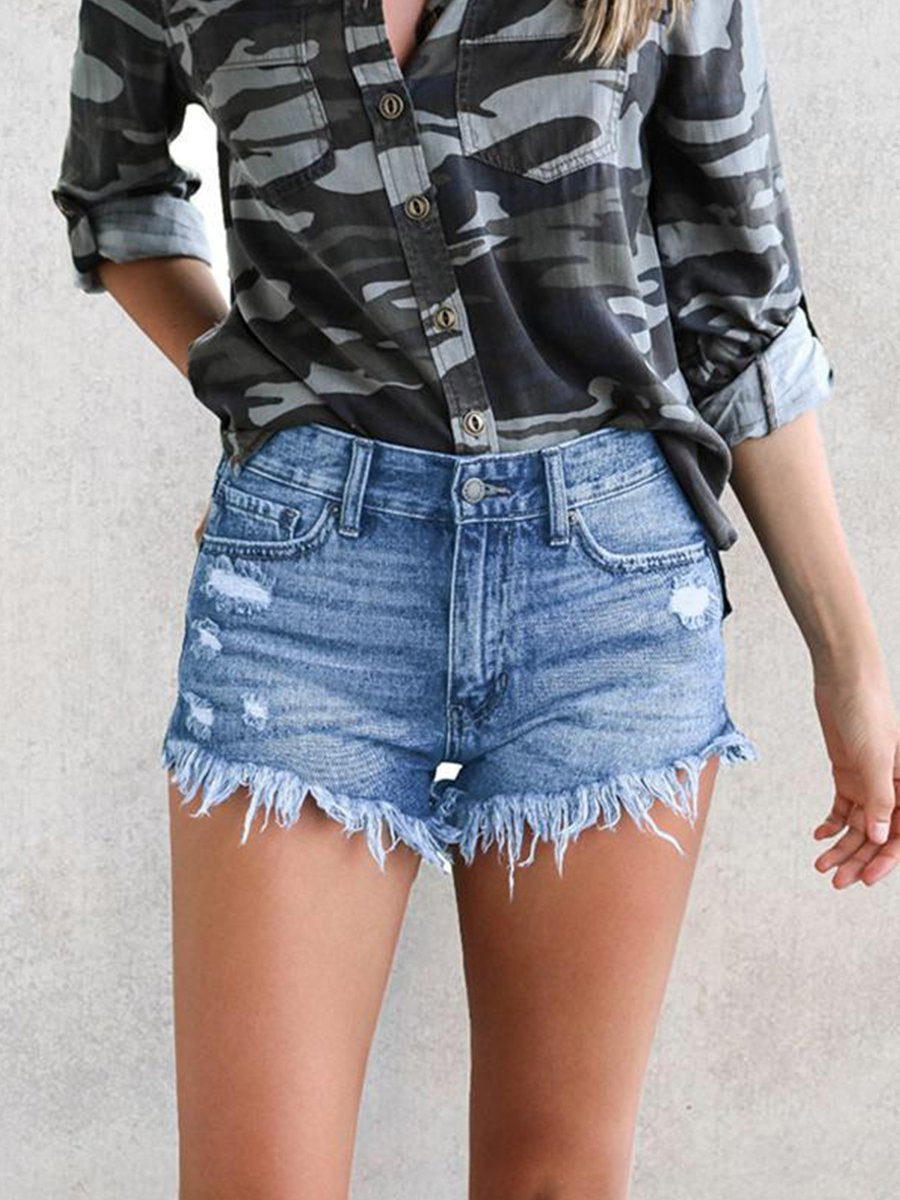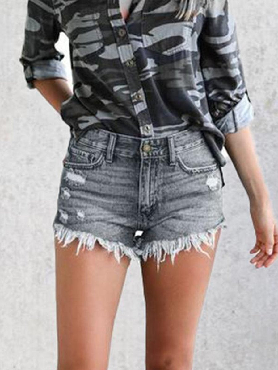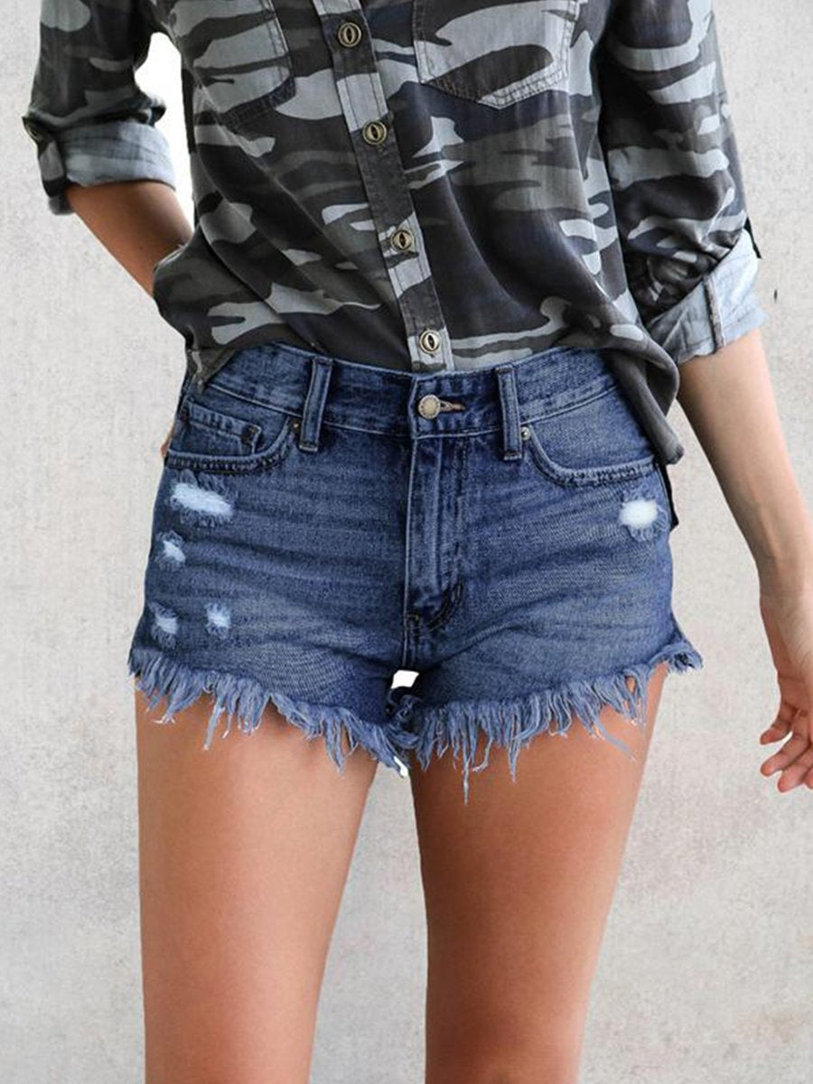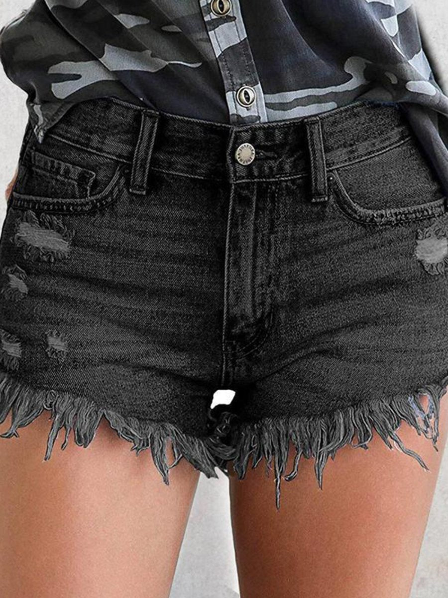 Ripped Fringed Stretch Denim Shorts