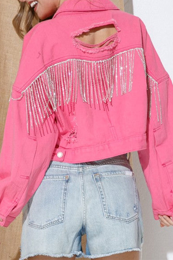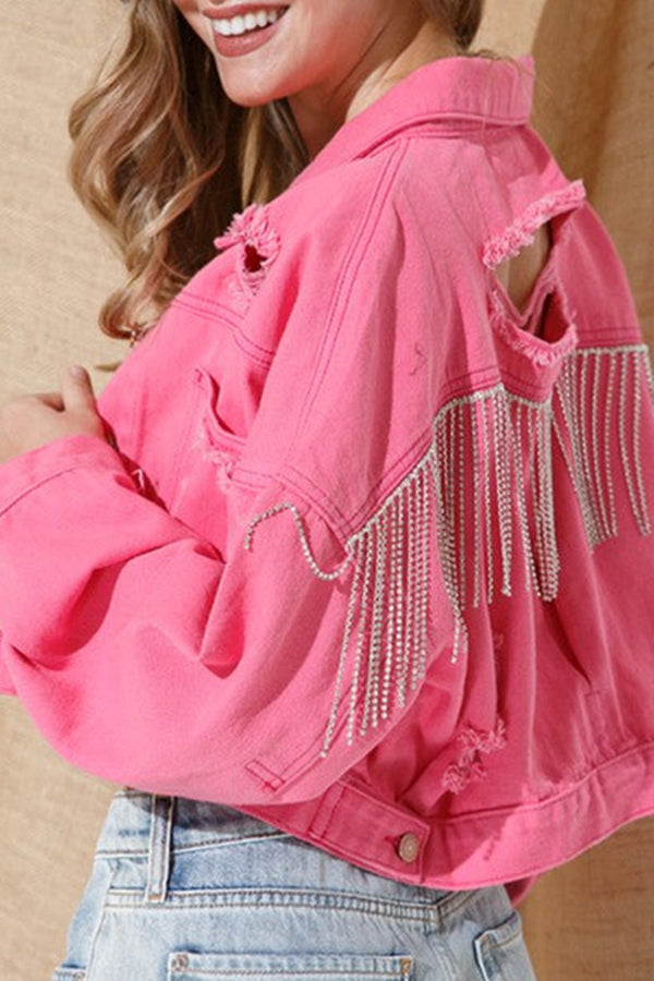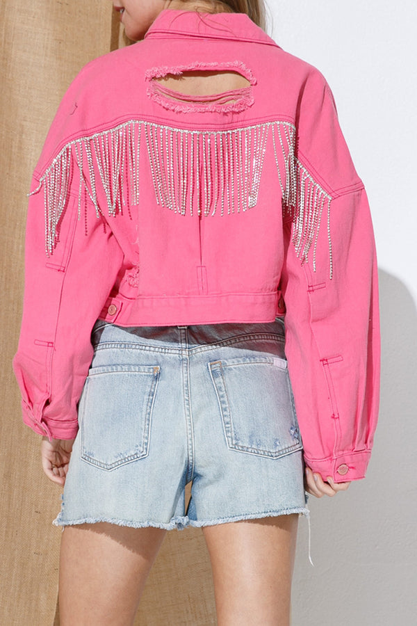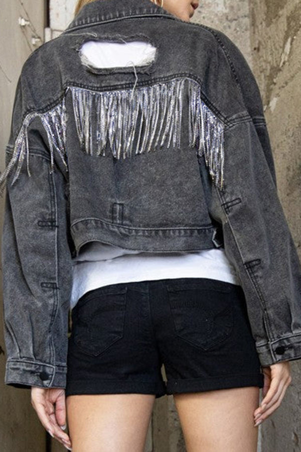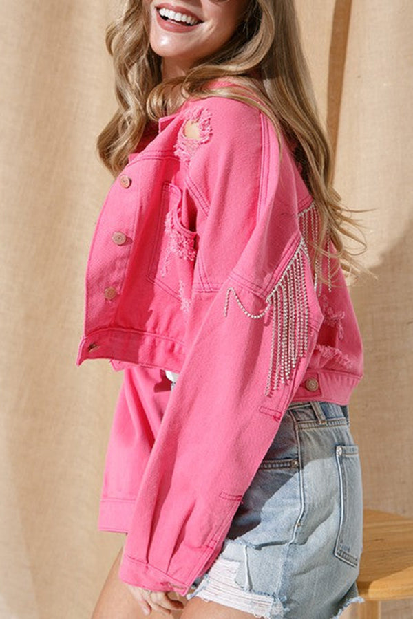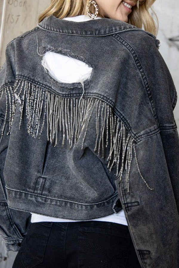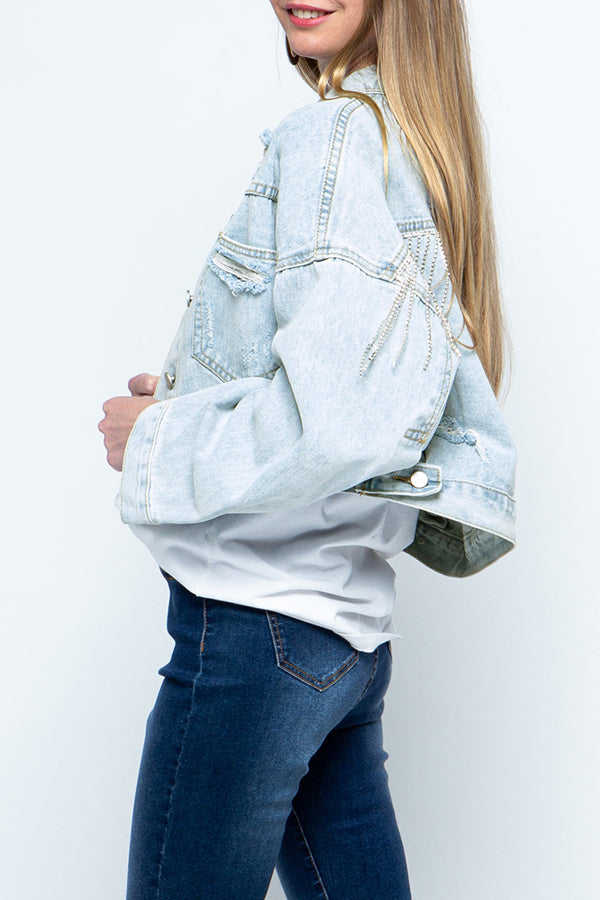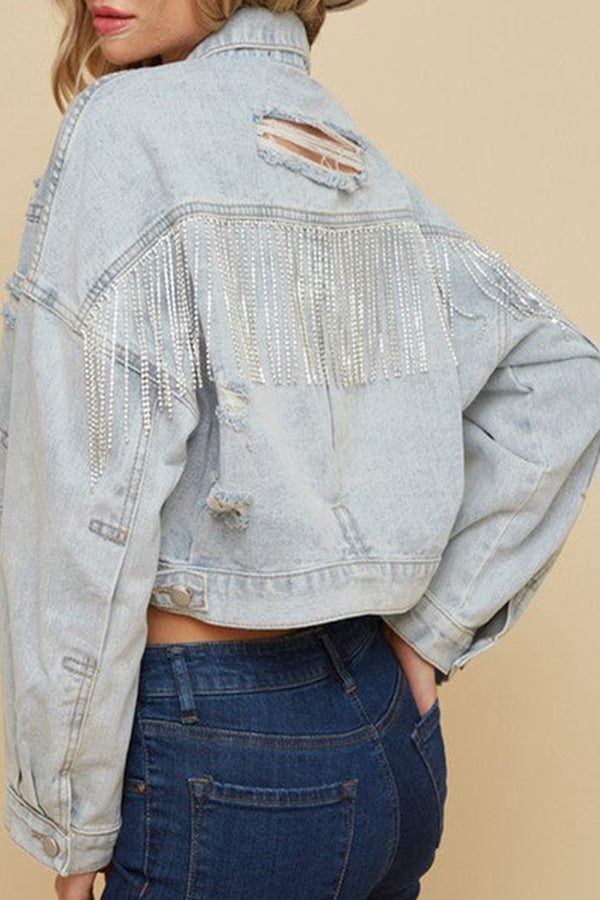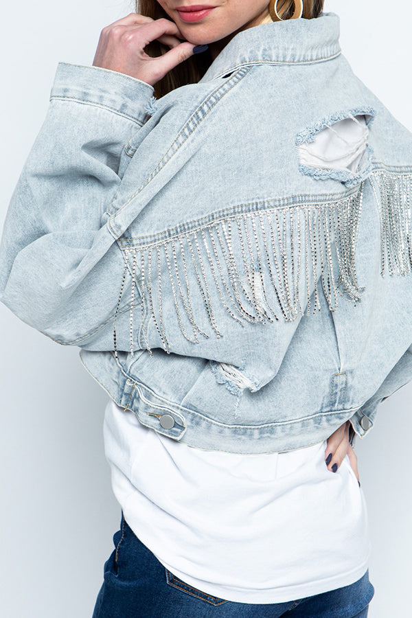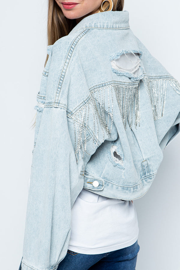 Ripped Rhinestone Fringed Denim Jacket