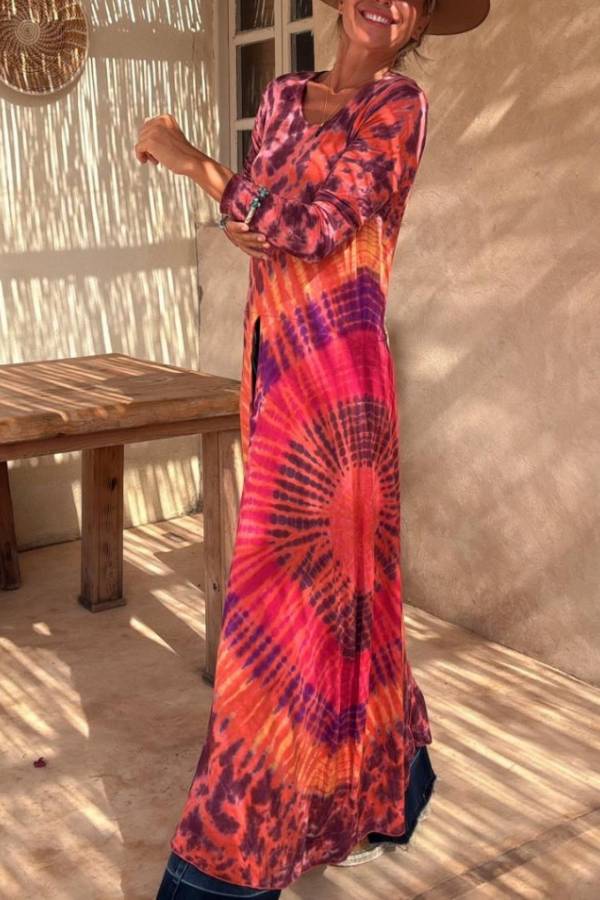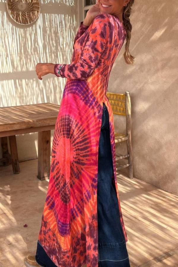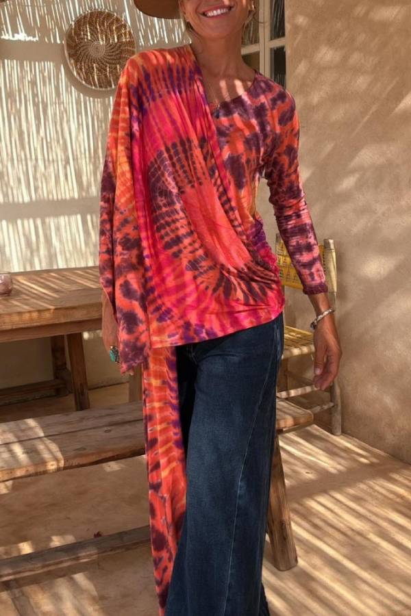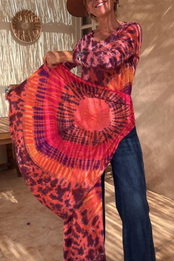 Elastic top with a round neckline and long sleeves, it has slits in the front and back.