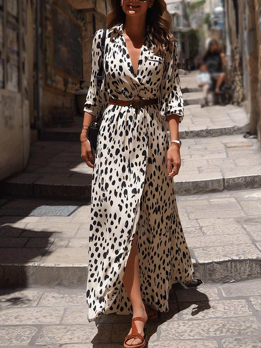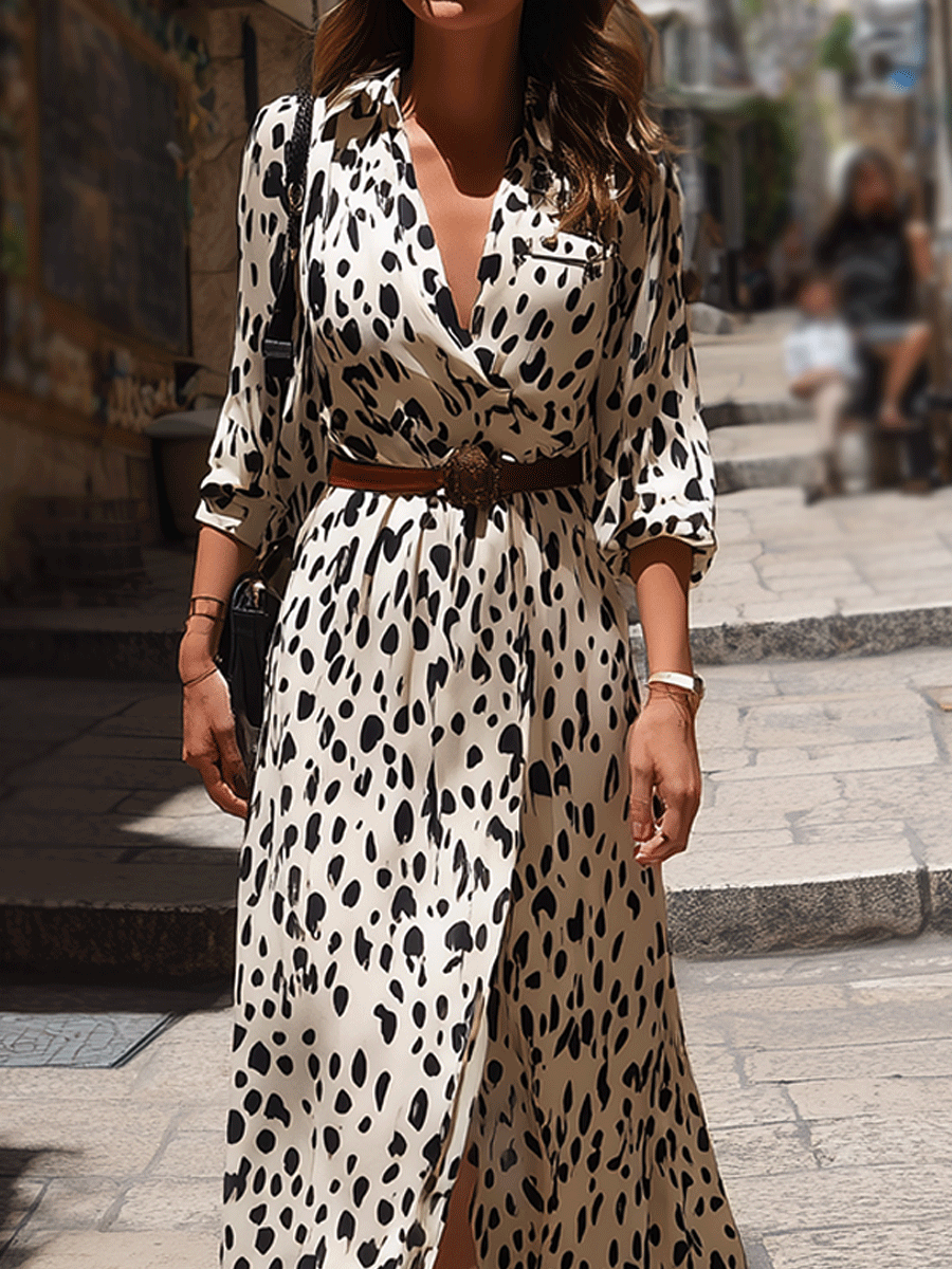Romantic Belted Slit V-Neck Animal Print Maxi Dress