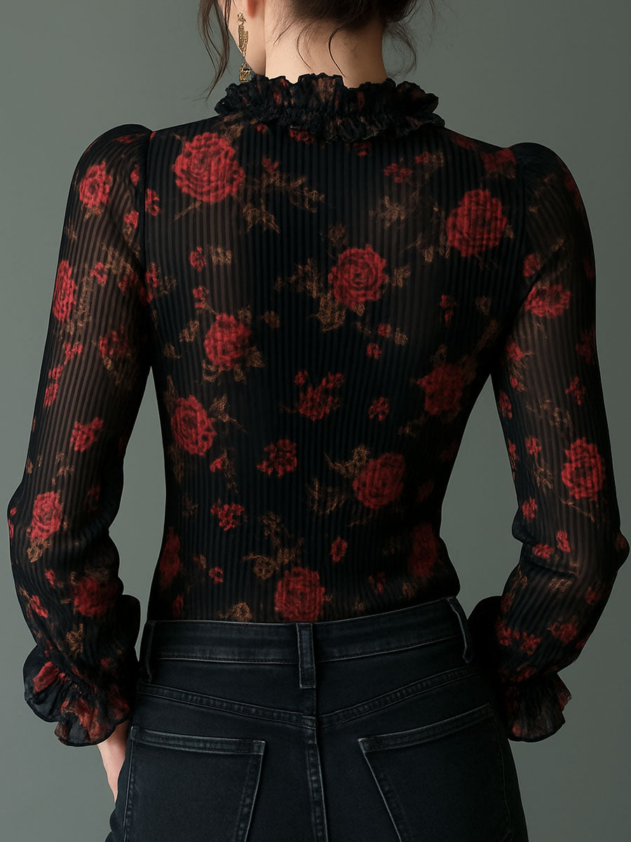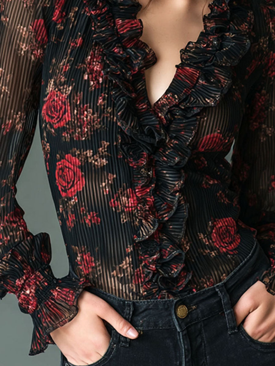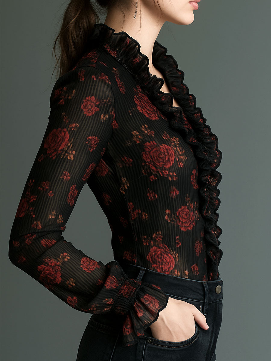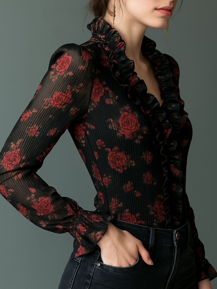 The Romantic Ruffled Black Rose Floral Print Blouse is a must-have addition to any wardrobe, offering a unique blend of sophistication and romance. Perfect for those who wish to make a fashion statement, this blouse promises to bring elegance and charm to any occasion.