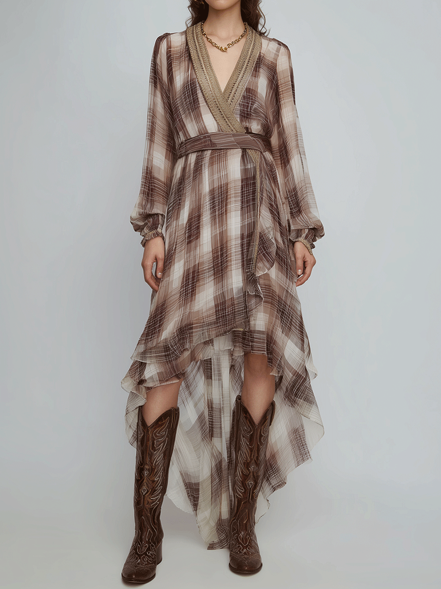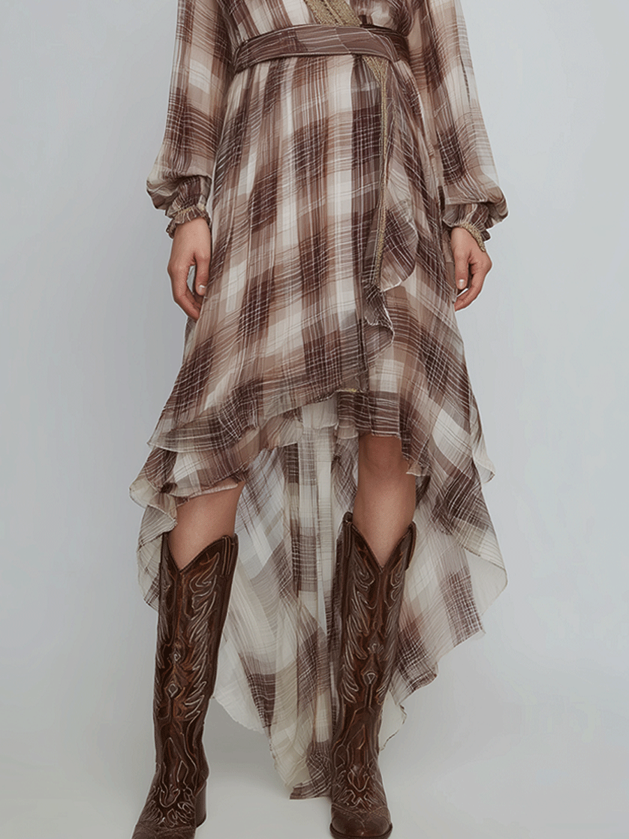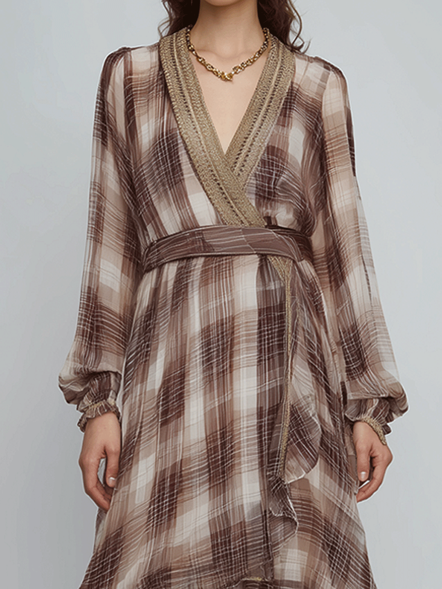 Romantic Soft Plaid Ruffle Chiffon Maxi Dress