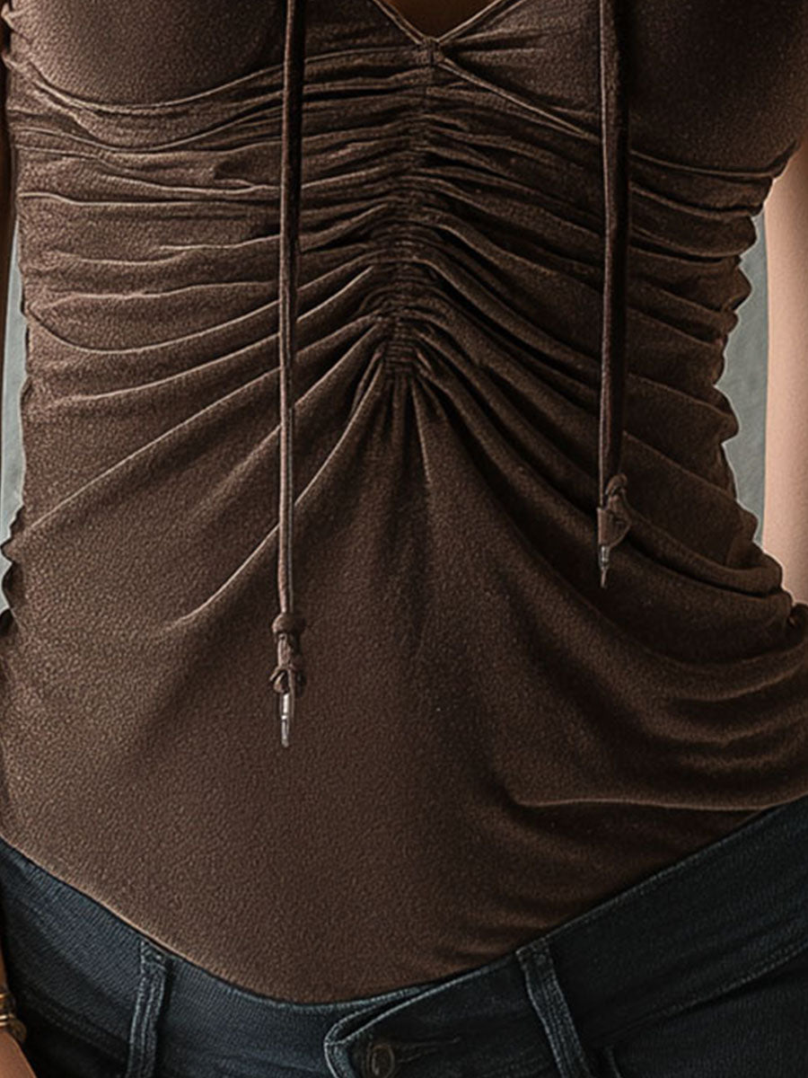Overall, the Ruched Brown Velvet Fitted Short Sleeve Hooded Top is a must-have for those who appreciate luxurious fabrics with contemporary design twists. Whether dressing up or down, this top offers versatility and style that can effortlessly transition from day to night.