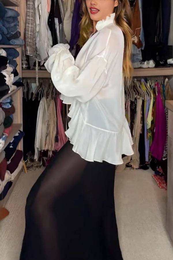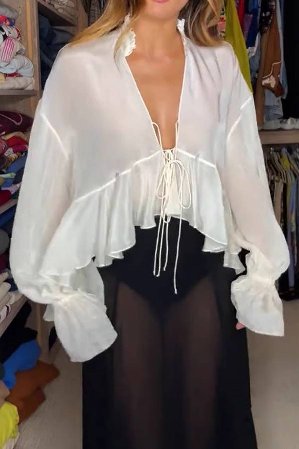 This top features a white sheer fabric, adorned with ruffles, a drawstring V-neck, and puff sleeves, creating a sophisticated and subtly sexy style. The sheer material enhances a sense of ethereal elegance, while the ruffles and drawstring design flatter the figure, and the puff sleeves add a feminine touch, offering both decorative appeal and stylish flair.