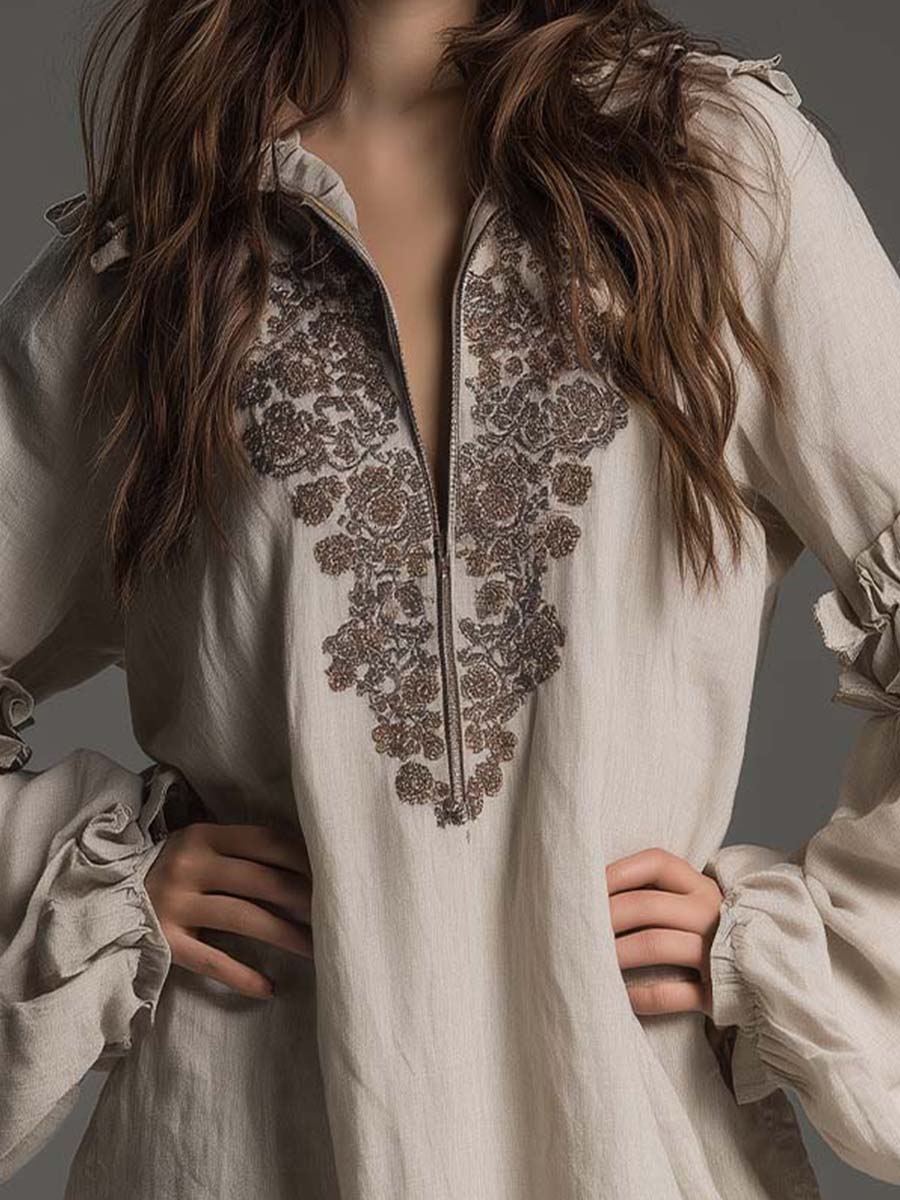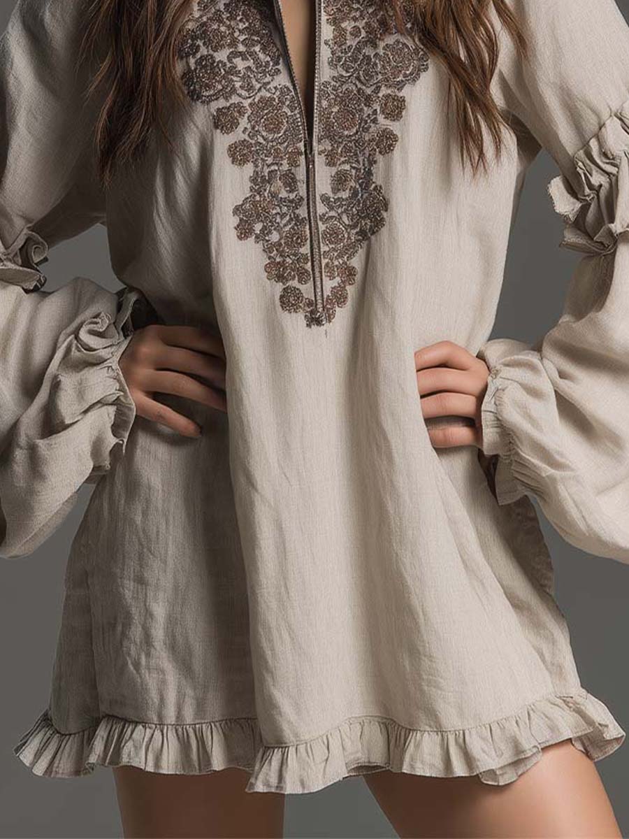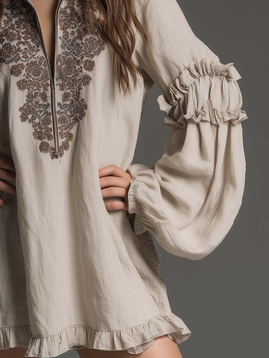 A soft, effortless boho mini dress designed with a romantic, artisanal touch. Crafted from breathable woven fabric with a natural drape, it features intricate chest embroidery in earthy tones and a half-zip neckline for adjustable styling. Voluminous lantern sleeves with tiered ruffle cuffs add movement and texture, while the gently ruffled hem brings a feminine finish. A perfect blend of comfort and refined bohemian charm.
