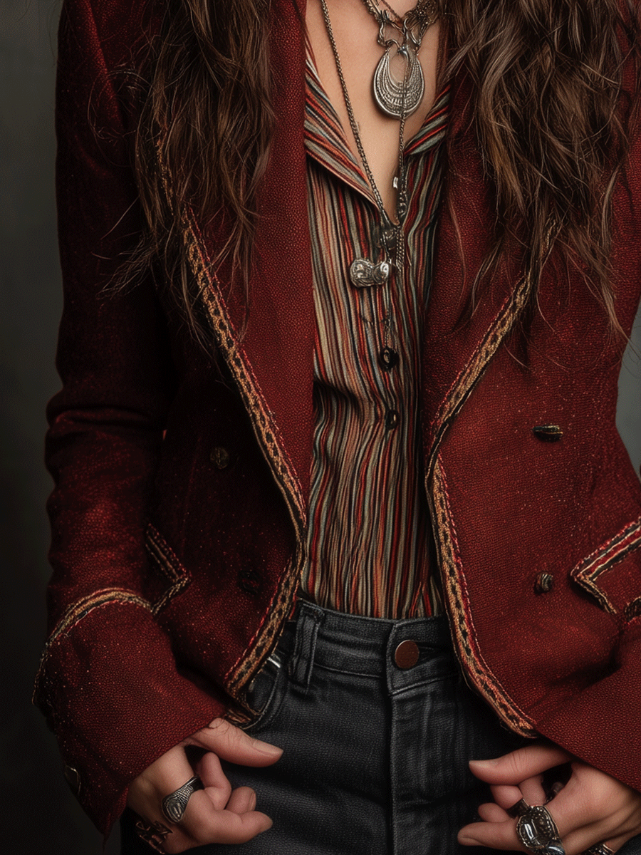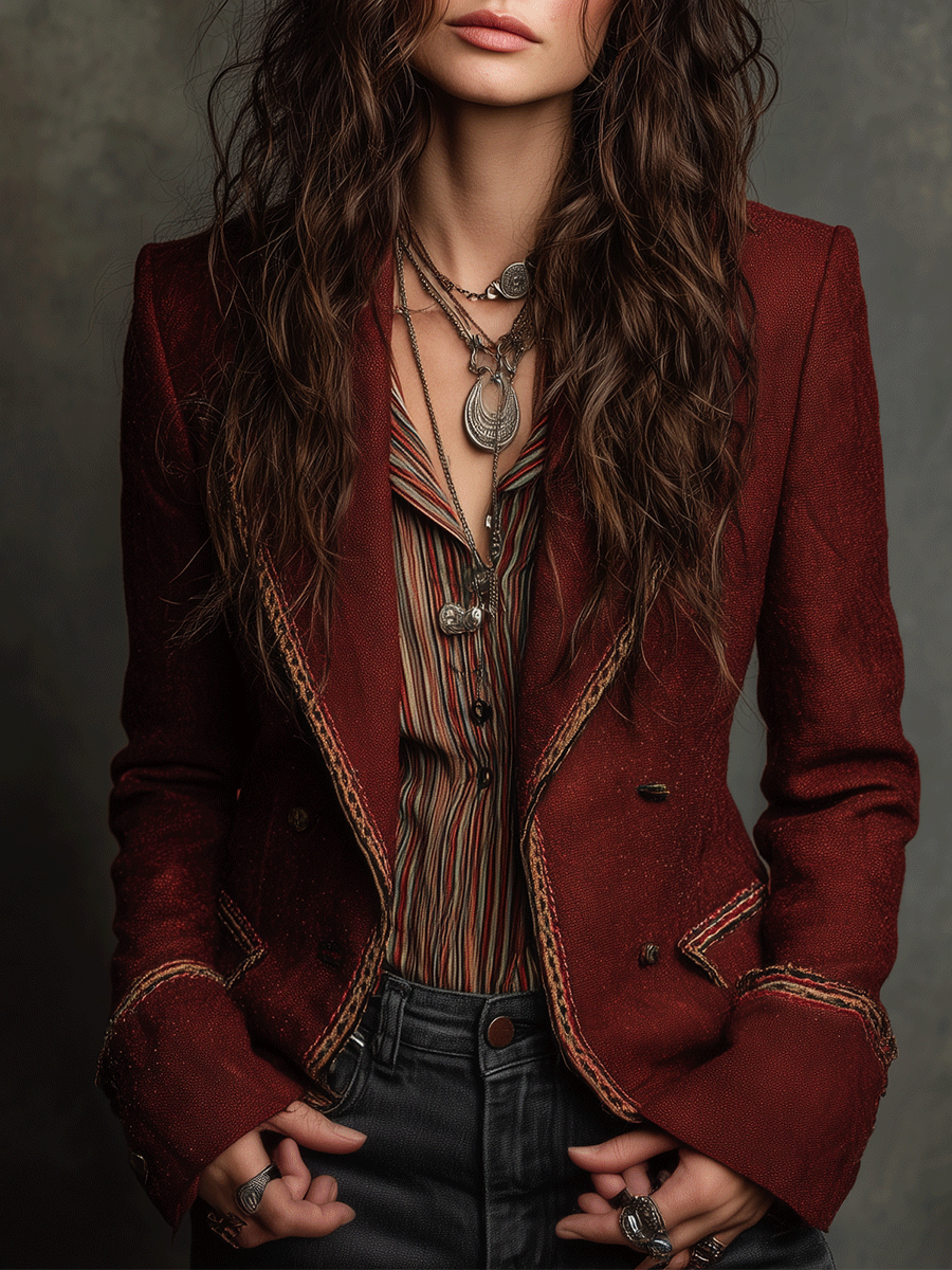 This blazer is perfect for both professional and casual environments. Pair it with dark trousers and a crisp white shirt for a sophisticated office look. For a more relaxed setting, style it with denim jeans and a simple turtleneck. The rich rust hue also complements earth tones, making it easy to integrate into various seasonal wardrobes.