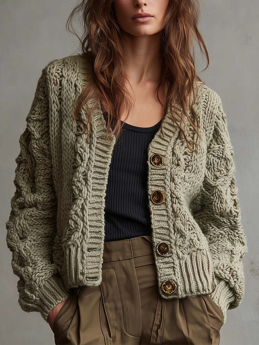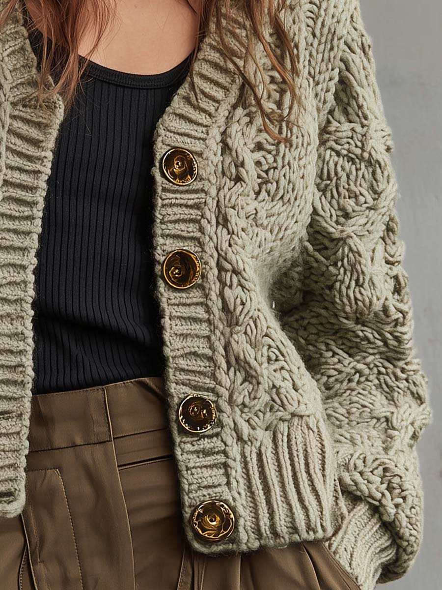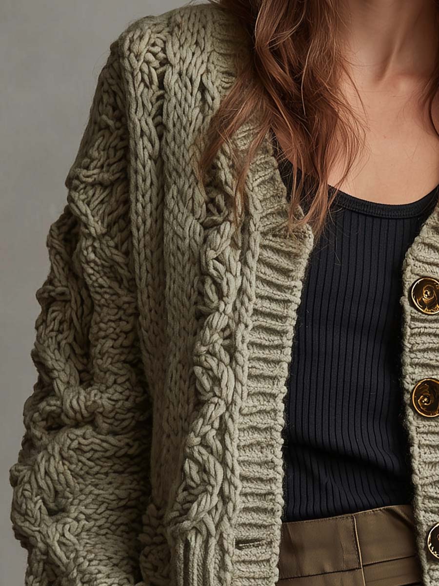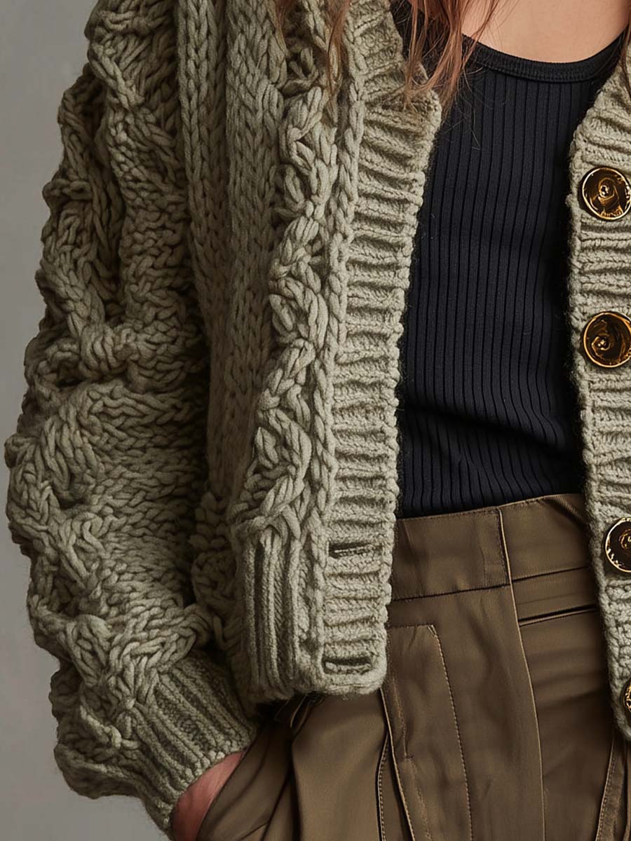 Crafted from ultra-chunky yarn in a richly textured hand-knit style, this cardigan balances rustic charm with bold design. Sculpted sleeves and oversized gold buttons create a striking silhouette, while the neutral olive hue grounds the look in earth-inspired minimalism. Perfect for layering over simple tanks or turtlenecks, it lends a tactile, confident feel to any fall-winter outfit.