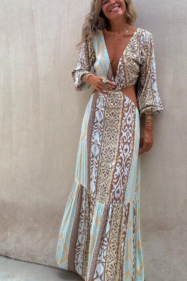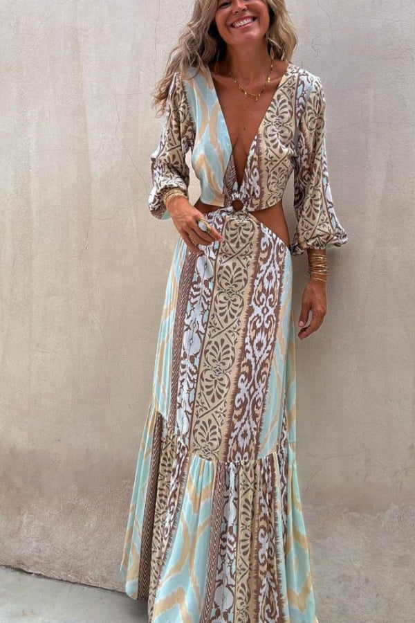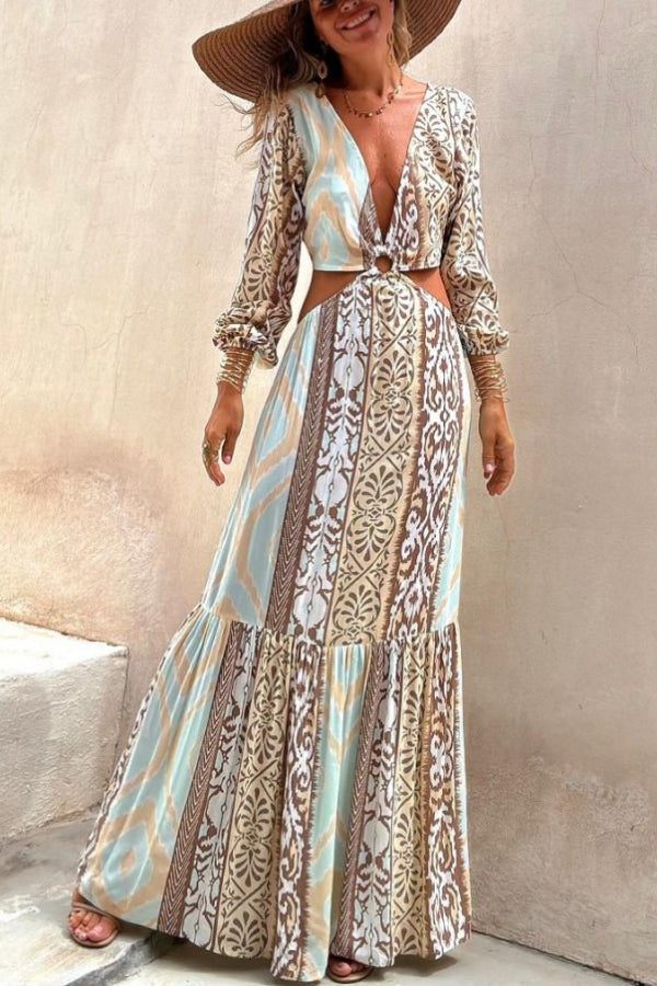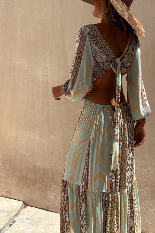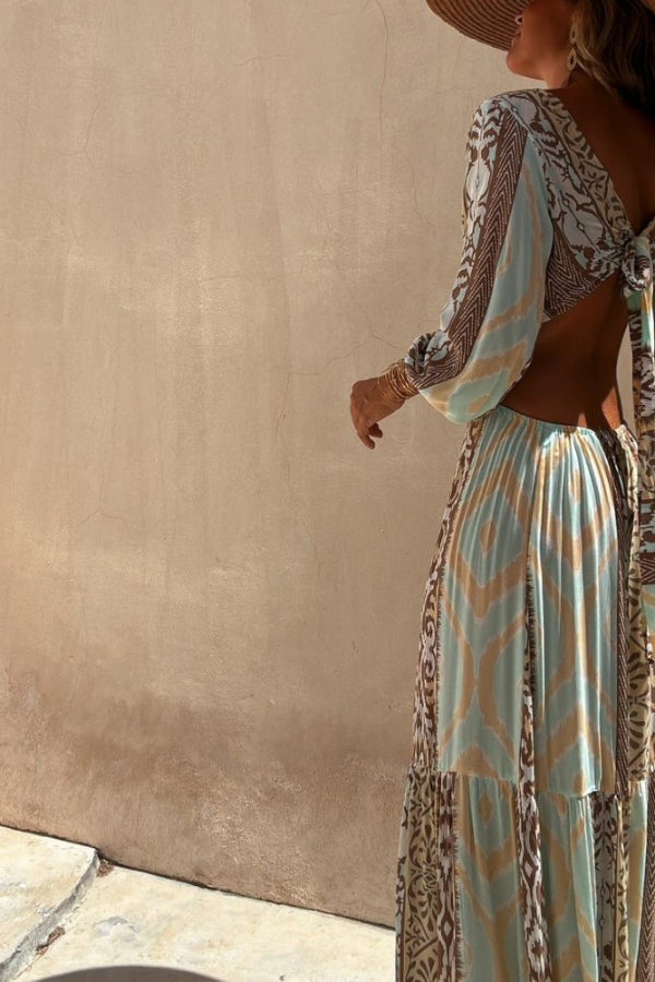 Sefora Unique Color Block Print Long Sleeve Ring Cutout Back Tie-Up Maxi Dress