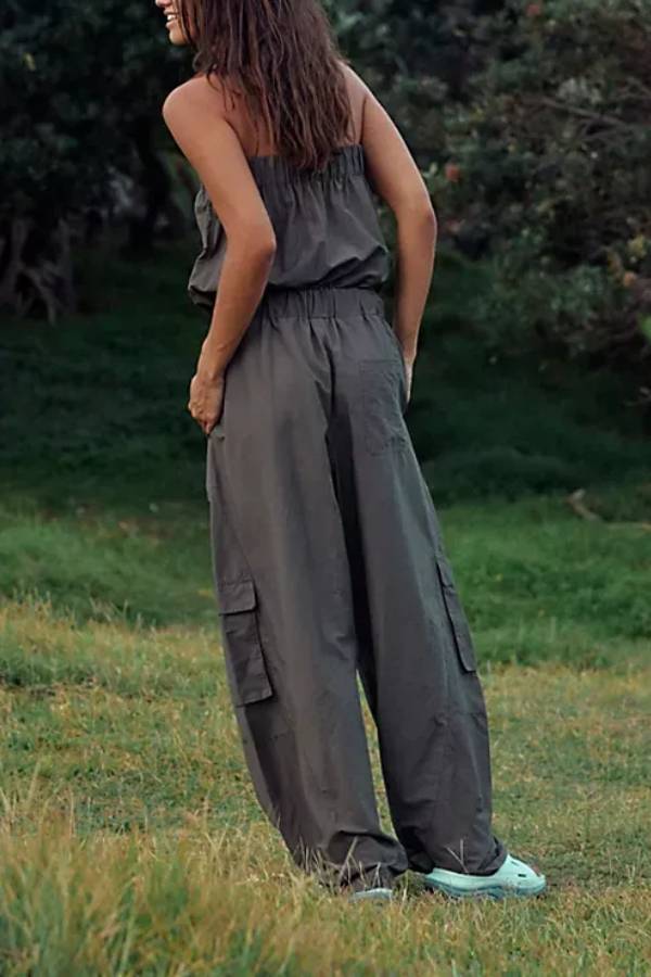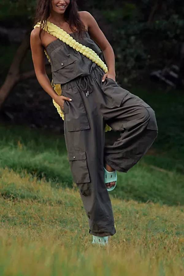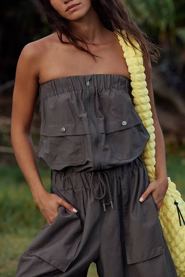 Cargo-inspired edge meets a so-comfy utility fabrication in this strapless onesie, with a flattering wide-leg silhouette and adjustable, elasticated waistband to give you a perfectly cinched look on the go.