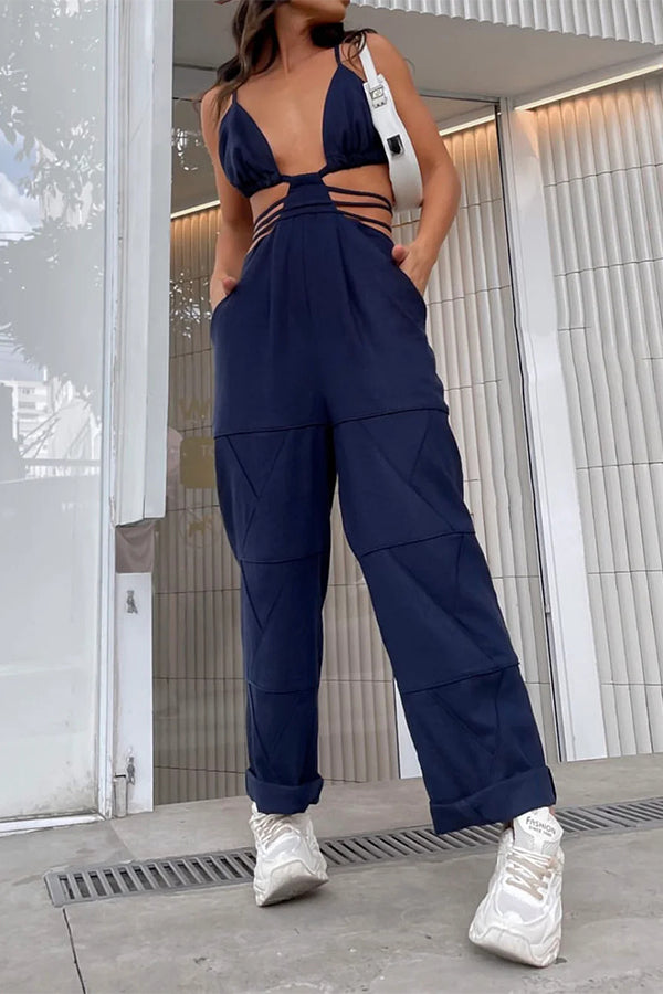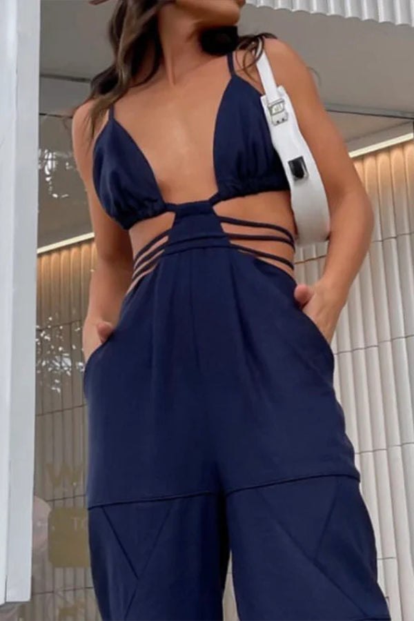 V-neck wide-leg pants suspenders solid color long jumpsuit