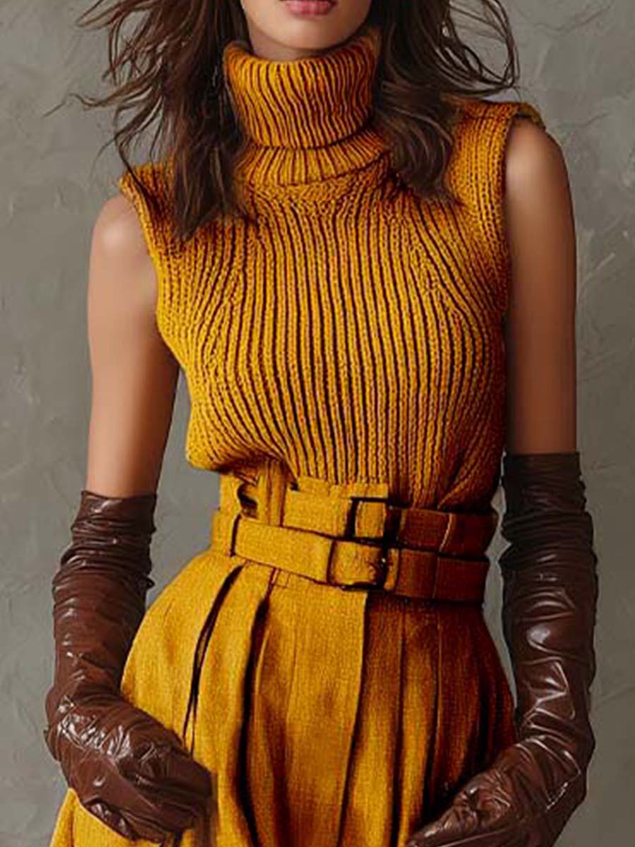 A statement-making set that blends bold color with timeless elegance. The sleeveless ribbed turtleneck knit top offers a sleek, body-skimming silhouette, while the high-waisted wide-leg pants create effortless volume and movement. Finished with a matching double-buckle belt to define the waist, this set is perfect for making an entrance — whether at a fall brunch or an evening event.