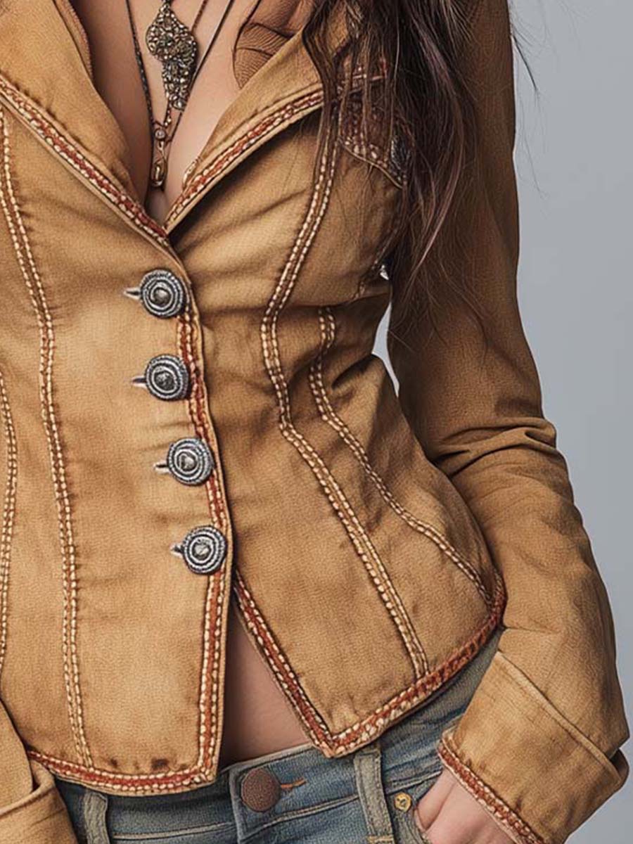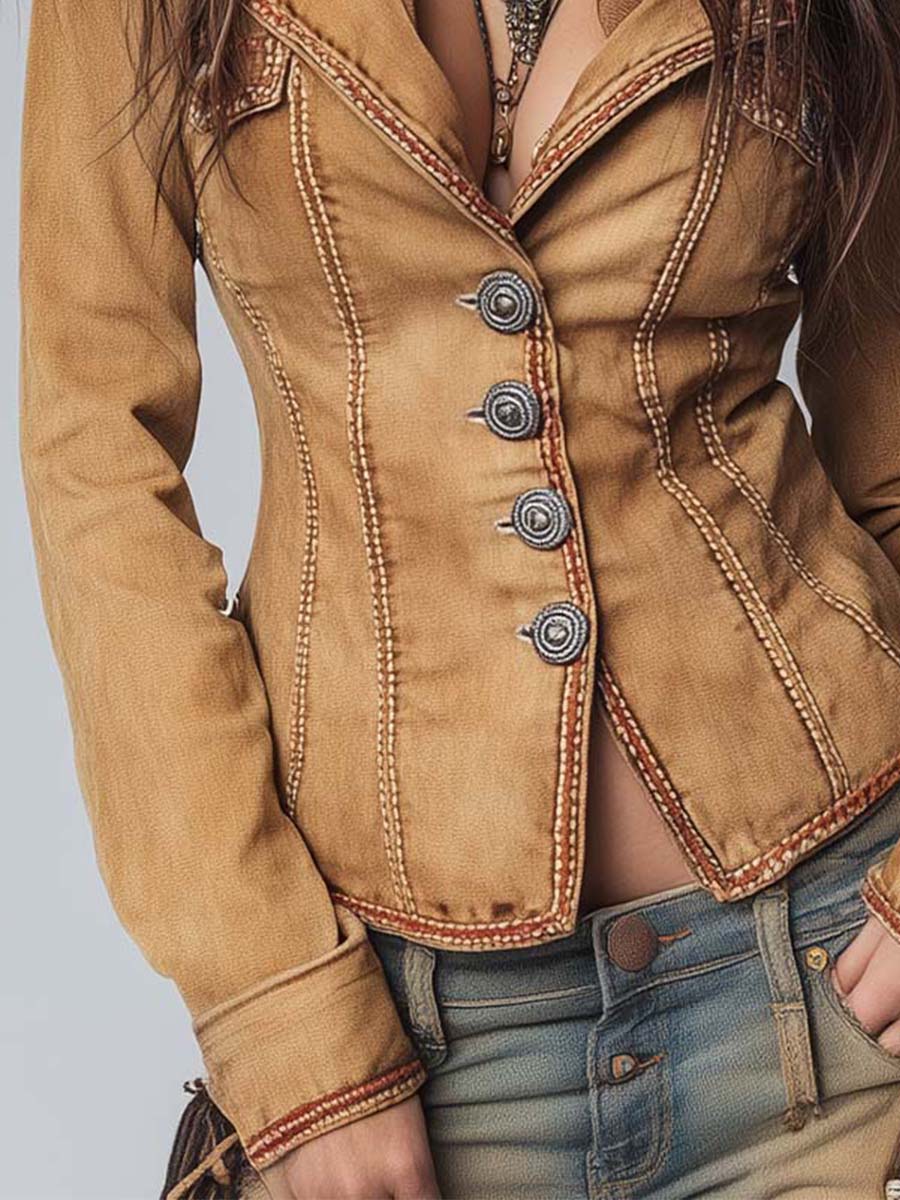Slim-fit Vintage-style Washed Khaki Denim Jacket