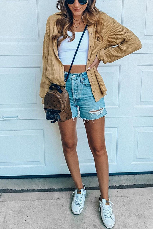 Solid Button Pocket Casual Shirt Waffle Jacket