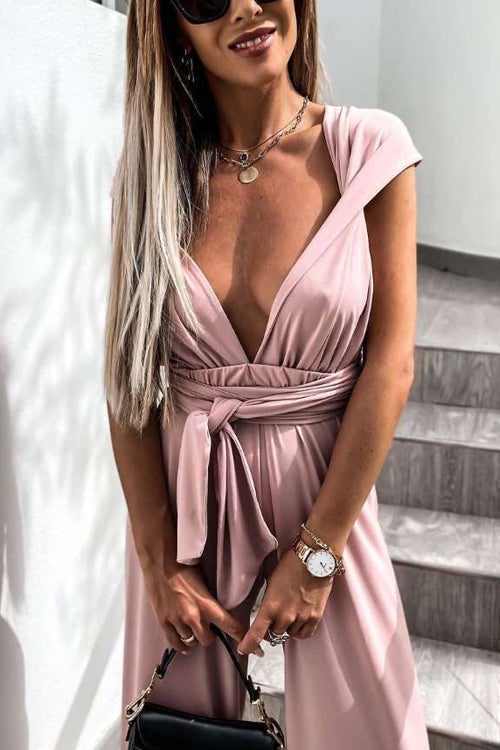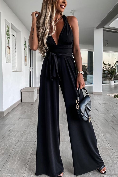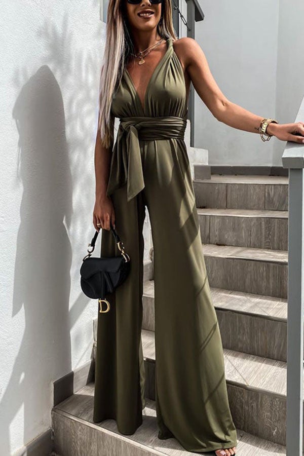 Solid Color Slim V Neck Lace Up Sleeveless Jumpsuit