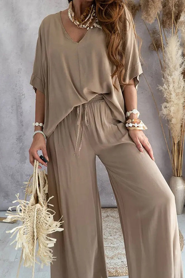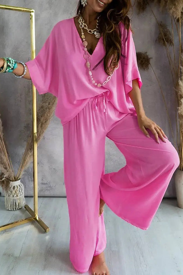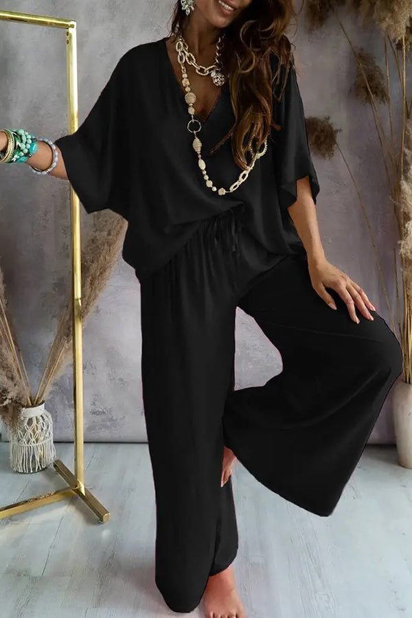 Solid Color V-Neck Loose Pants Suit