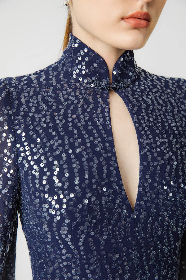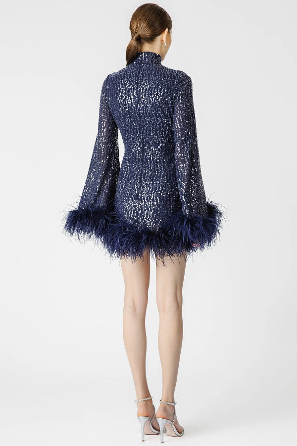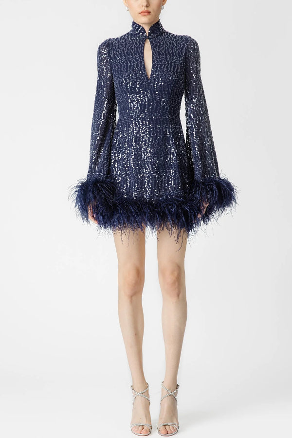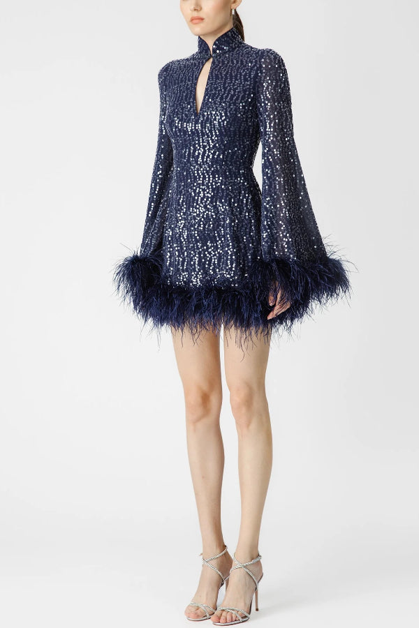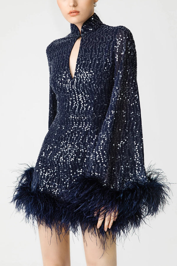 Stand Collar Feather Trim Sequin Mini Party Dress