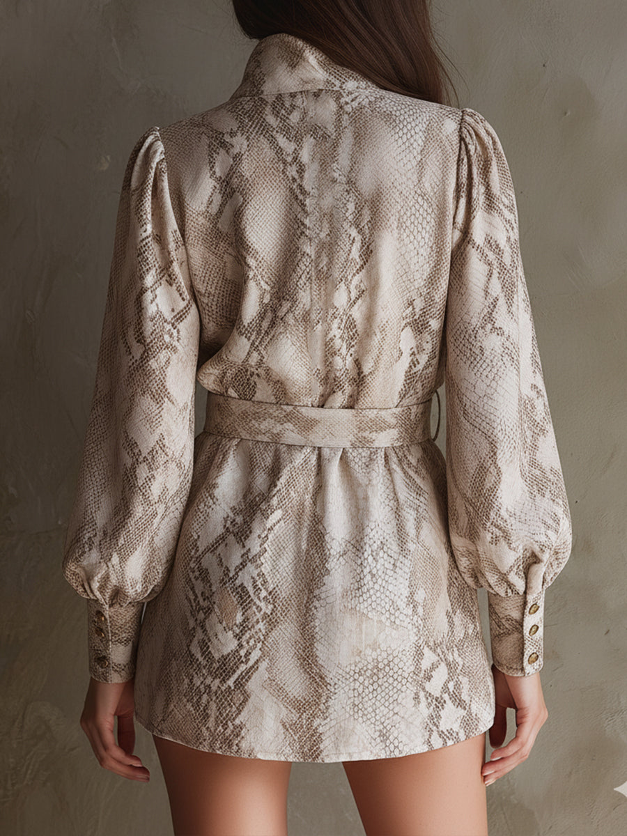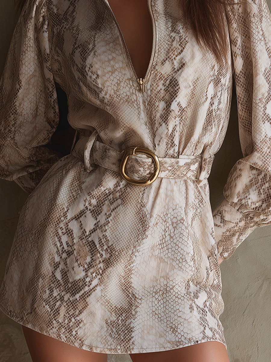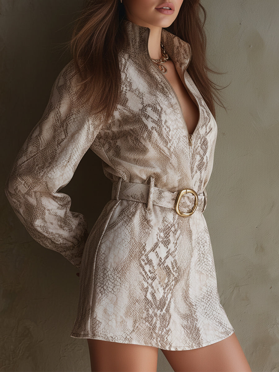 Stylish Snake Print Polyester Suede Mini Dress With Belt