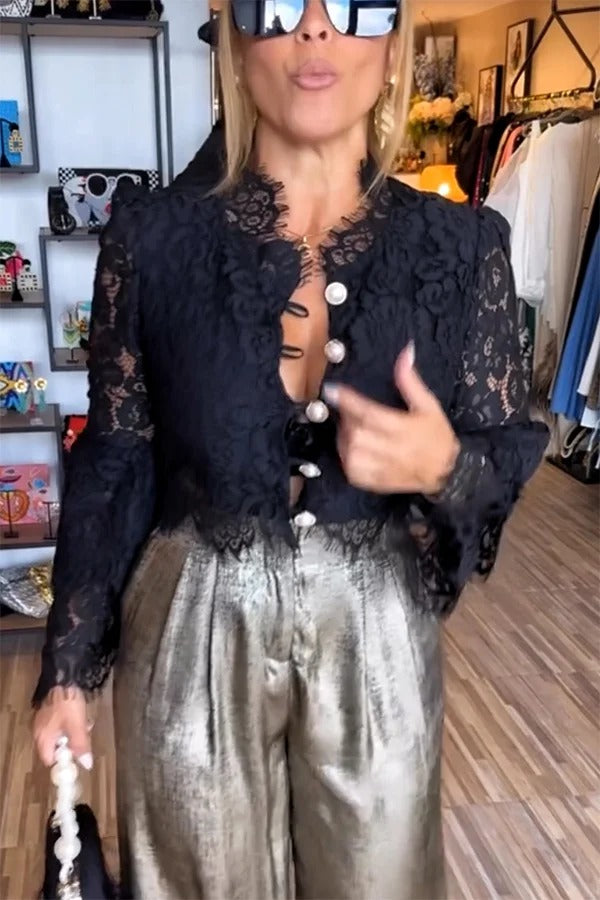 Sweet Embrace Floral Lace Pearl Button Bell Sleeve Crop Top