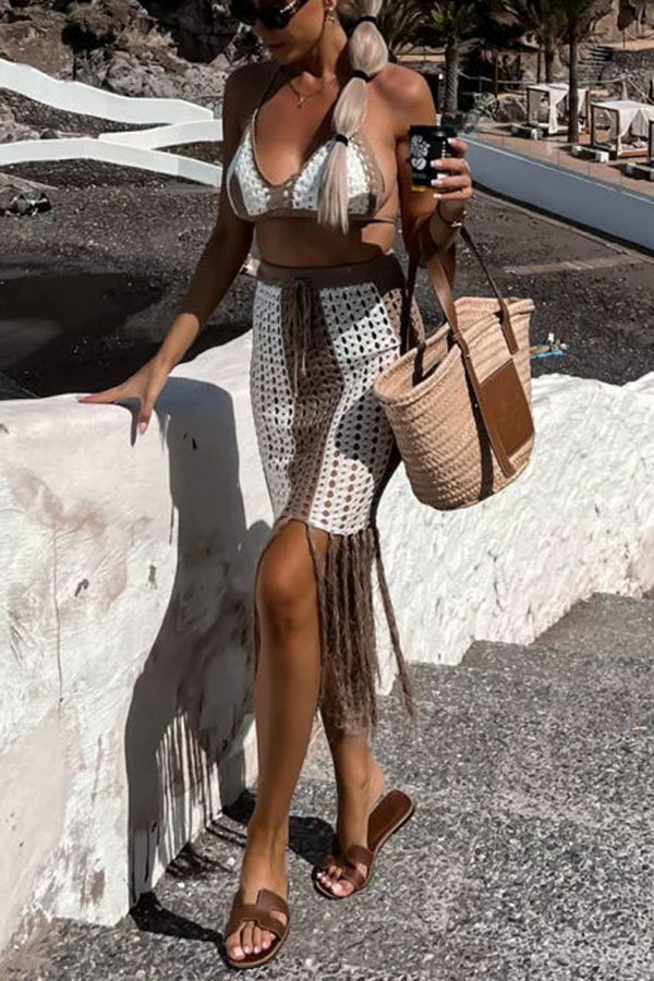 Talia Knit Color Block Hollow Out Halter Cami Bra and Tassel Skirt Set