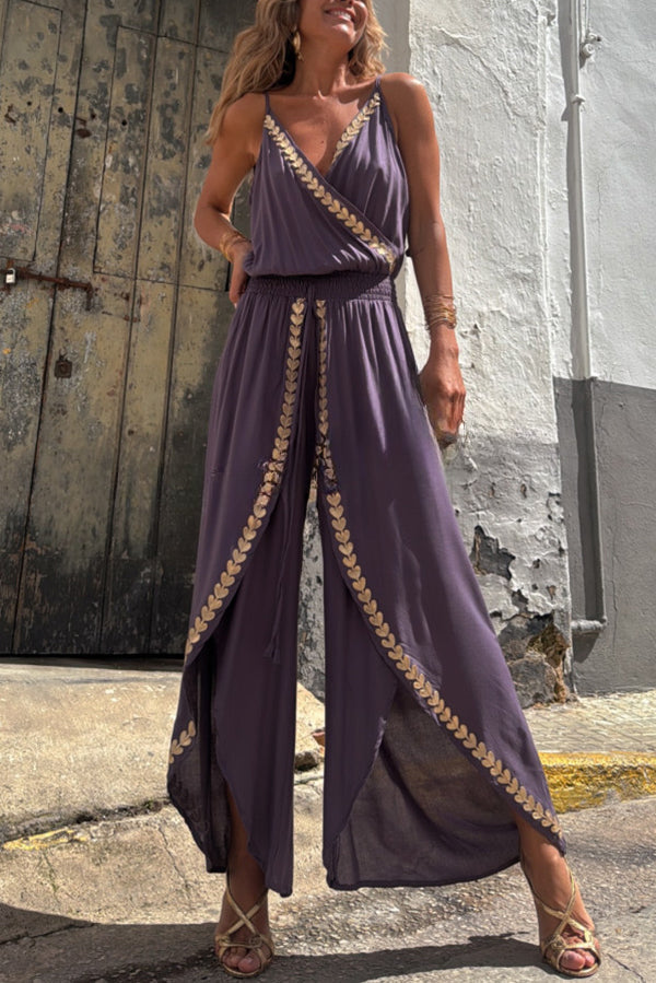 Tamia Gold Trim Elastic Waist Slit Wide Leg Slip Jumpsuit
