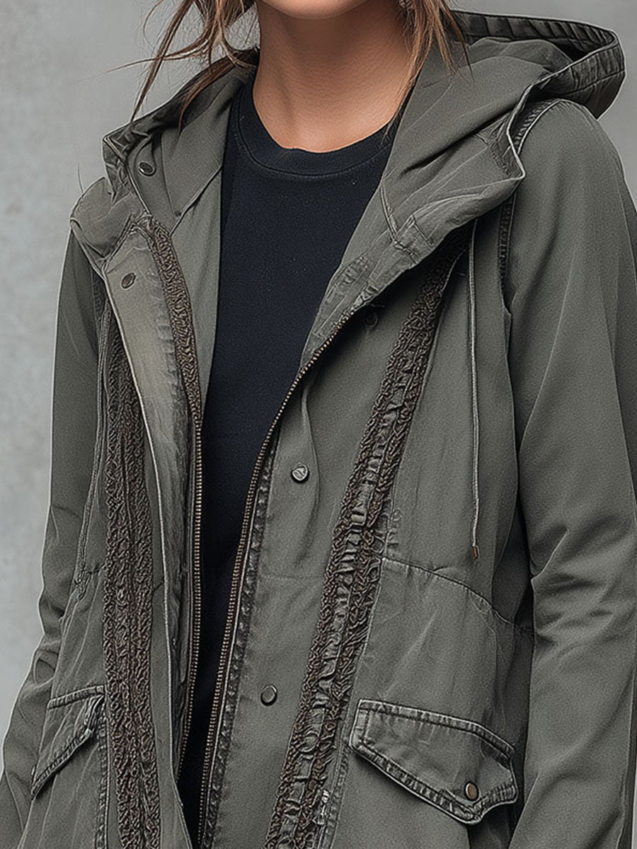 Utility Army Green Washed Denim Hooded Cargo Parka Jacket With Pockets