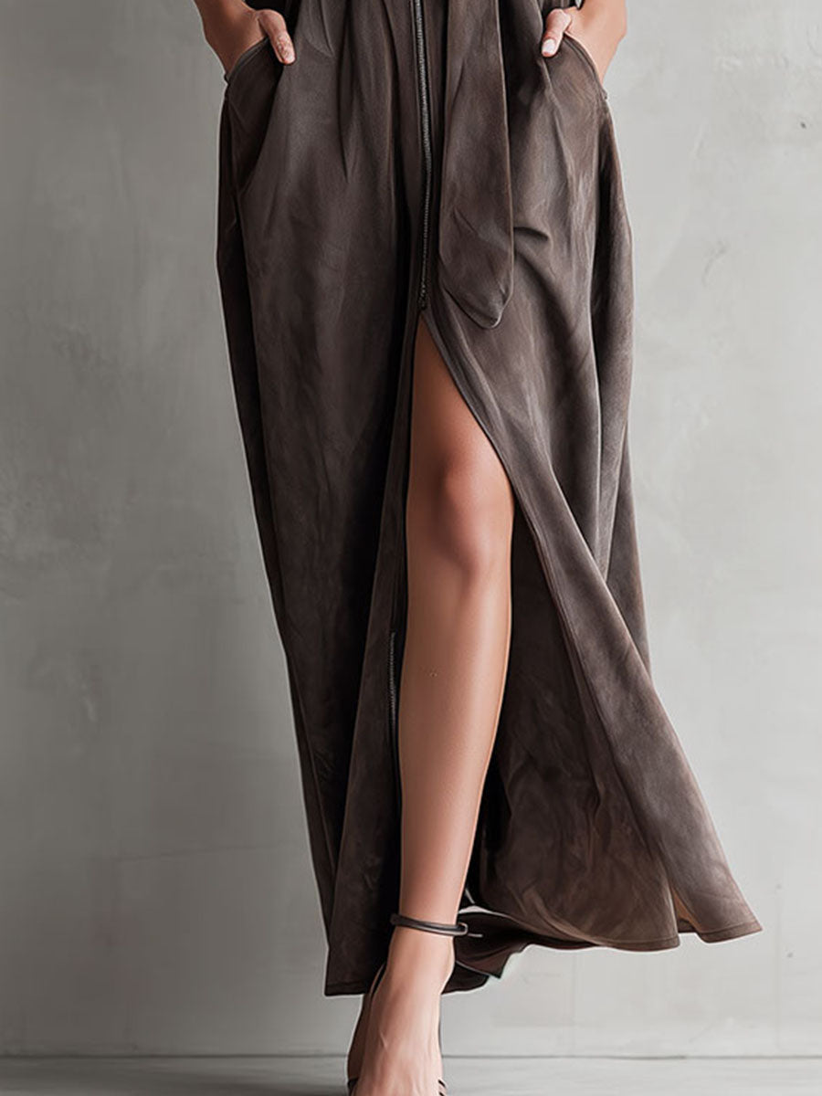 The Utility Taupe Eco Suede Zipper Belted Maxi Dress is a perfect choice for those seeking elegance with a conscience. Its sleek design, eco-friendly material, and versatile color make it an exceptional addition to any wardrobe. Whether styled casually or dressed up for an occasion, it offers both comfort and class.