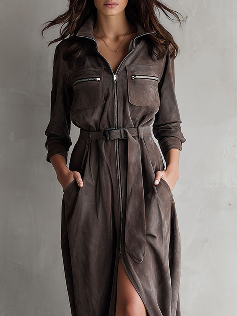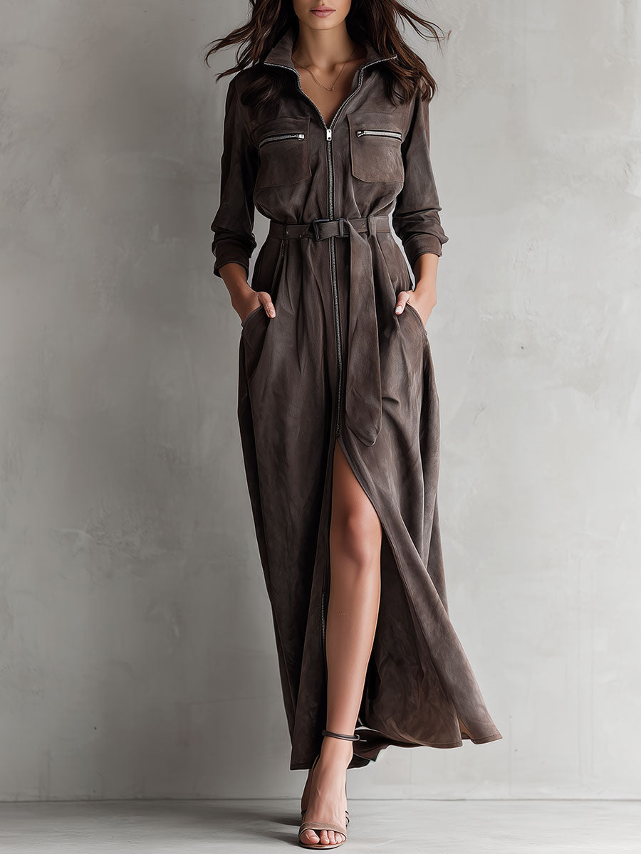 Utility Taupe Eco Suede Zipper Belted Maxi Dress