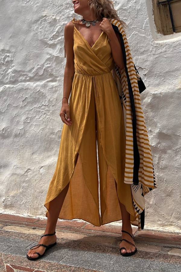 This jumpsuit features a lightweight, flowing fabric and a flattering silhouette with a V-neck, backless design, and split legs. The fabric is breathable and skin-friendly, while the backless and split-leg details enhance the relaxed feel of the garment. The fitted waist accentuates the body's curves. Suitable for vacations, casual dates, and other occasions, it can be paired with other pieces to create a "effortlessly elegant and retro relaxed" look. This is a core wardrobe piece that combines style and practicality.