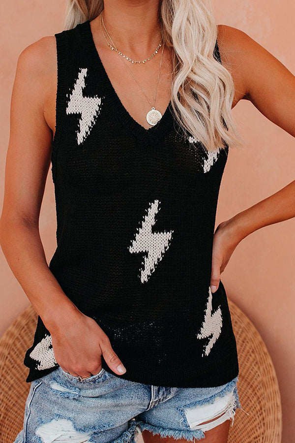 V-neck Lightning Print Vest Knit Sleeveless Top