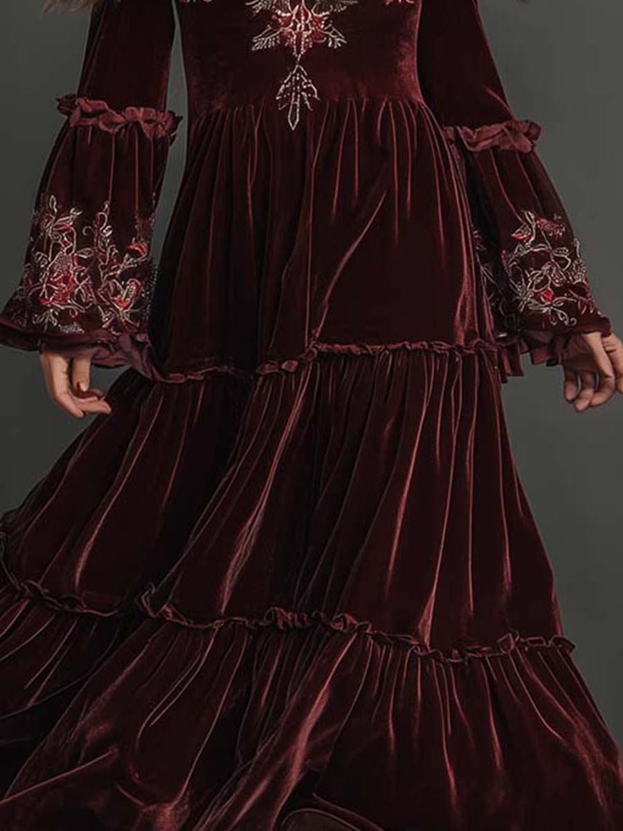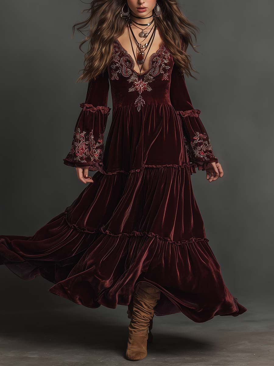This Velvet Bohemian Embroidered Maxi Dress captures the essence of vintage romance with a modern boho twist. Crafted from plush velvet in a deep wine tone, it features exquisite floral embroidery across the neckline and sleeves, adding a handcrafted charm. The tiered skirt flows gracefully with movement, while the flared sleeves and ruffled detailing enhance its free-spirited elegance. Perfect for making a statement at evening gatherings, seasonal celebrations, or artistic events, this dress blends comfort with captivating style.