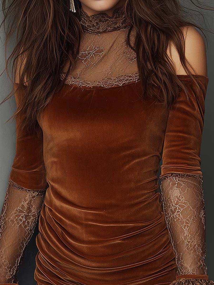 Elevate your evening style with this exquisite velvet mini dress, blending vintage-inspired romance with modern allure. The soft velvet fabric is ruched to flatter the silhouette, while delicate lace trims the neckline, cuffs, and hem for a touch of timeless femininity. With off-shoulder cutouts, flared lace sleeves, and a figure-hugging fit, this dress is the perfect balance of sensual and elegant.