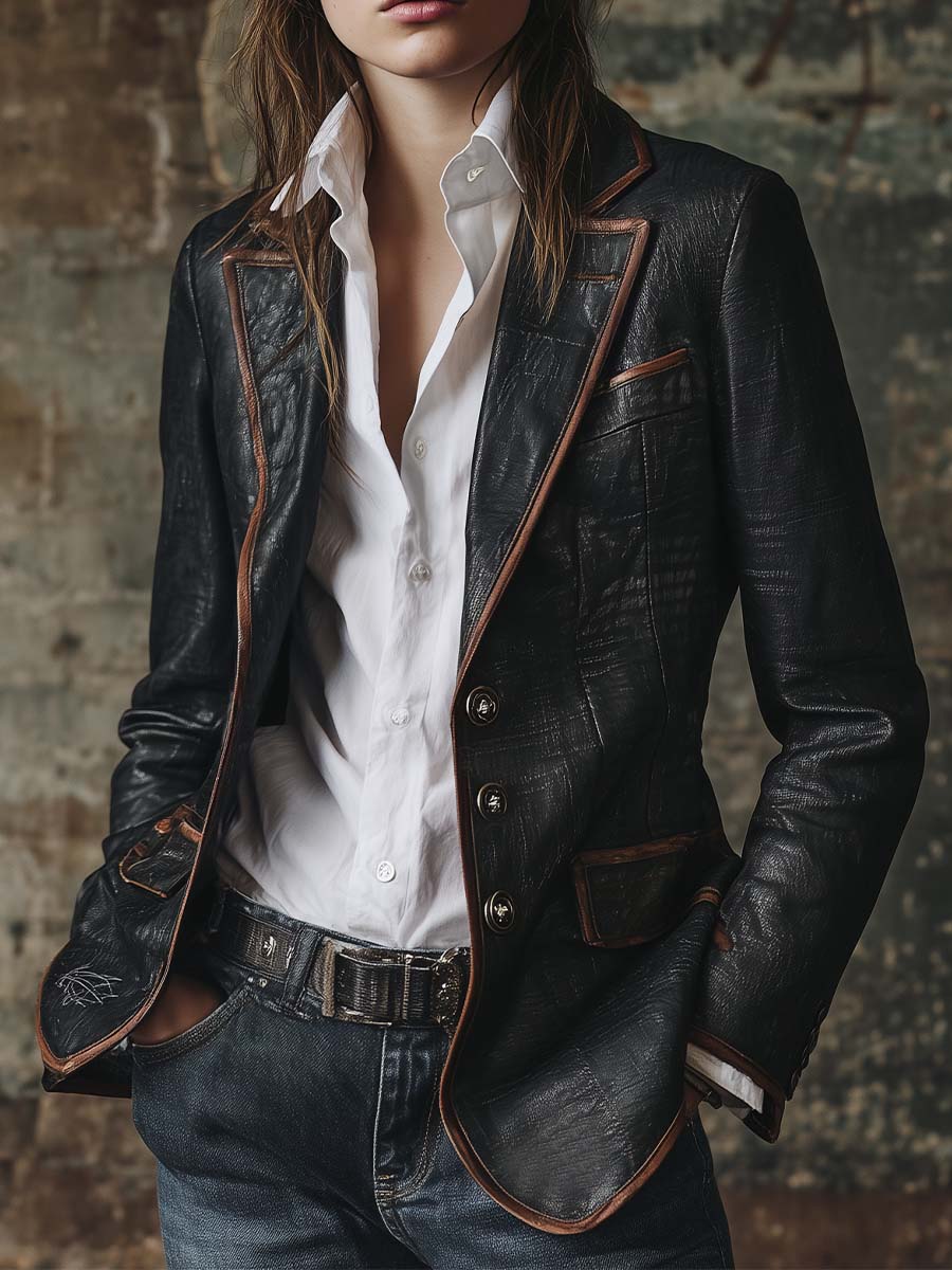Vintage Black Eco Leather Blazer With Contrast Trim