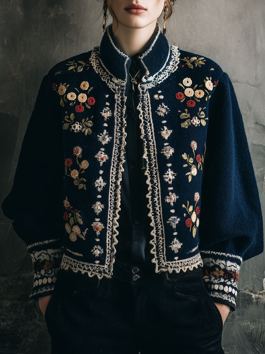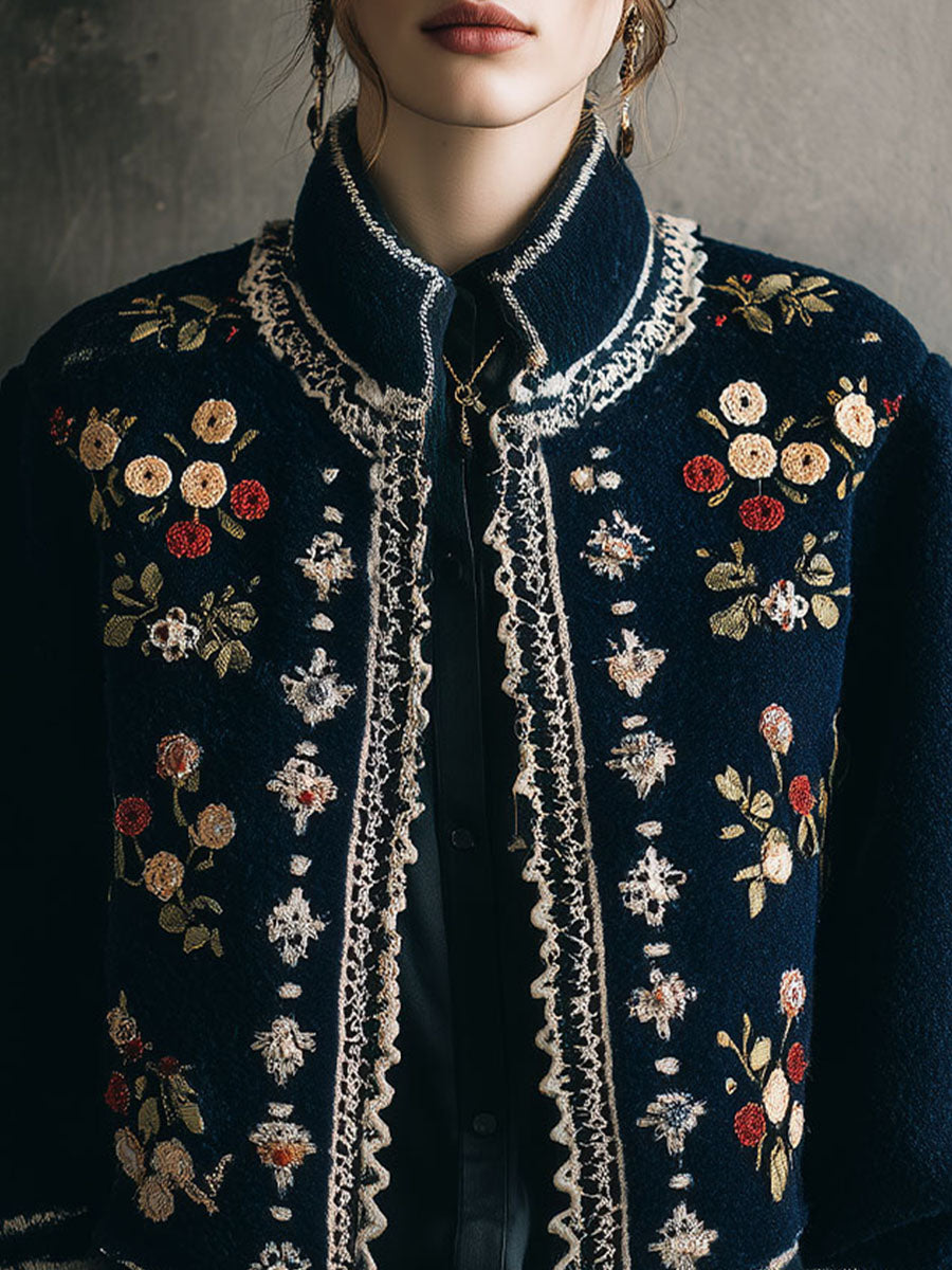 Vintage Bohemian Floral Embroidered Wool Jacket With Lace Trim