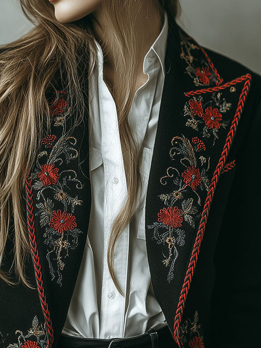 - Embroidery Design: Detailed floral embroidery adds a touch of bohemian charm to this classic black blazer.
