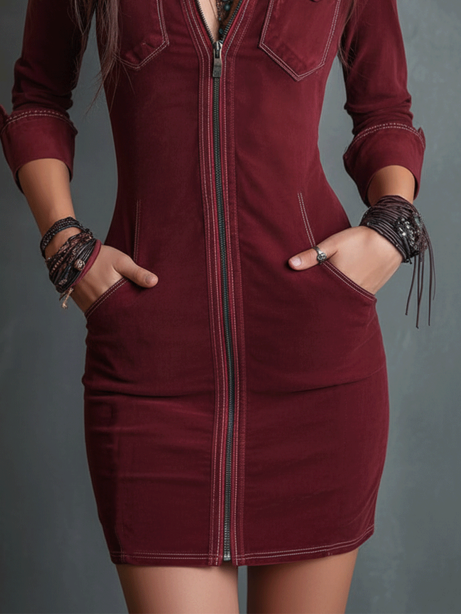 Vintage Boho Burgundy Zip-Up Utility Fitted Mini Dress