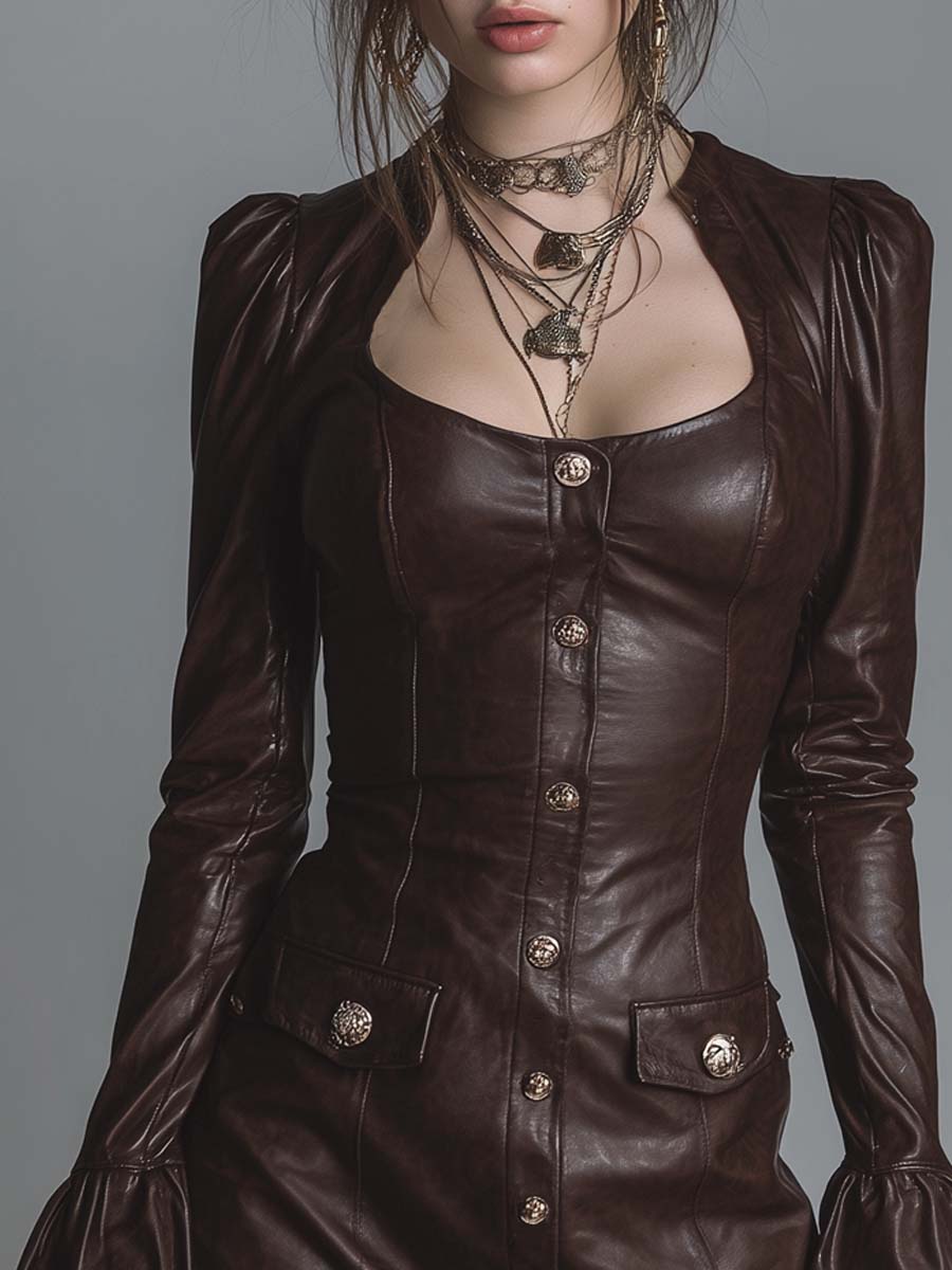 Step into the spotlight with this Vintage Button Lace Hem Faux Leather Mini Dress. Its blend of feminine lace and edgy faux leather offers a timeless yet modern look. Perfect for those who want to make a statement, this dress is as versatile as it is stylish.