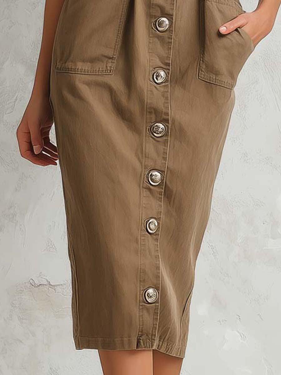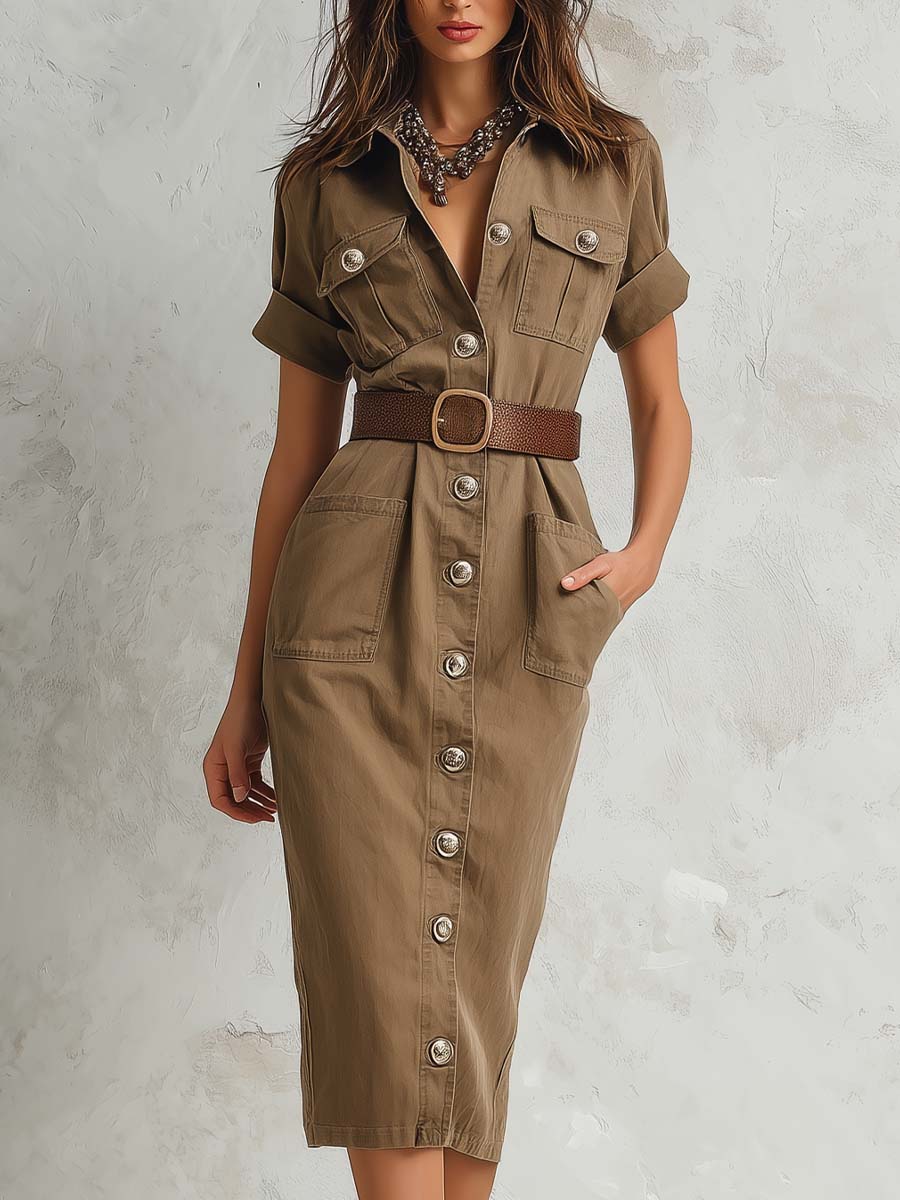 The Vintage Cargo-Inspired Khaki Midi Dress combines functionality with effortless style, making it a versatile addition to any wardrobe. Whether dressing up or down, this dress is perfect for those who value both comfort and elegance.