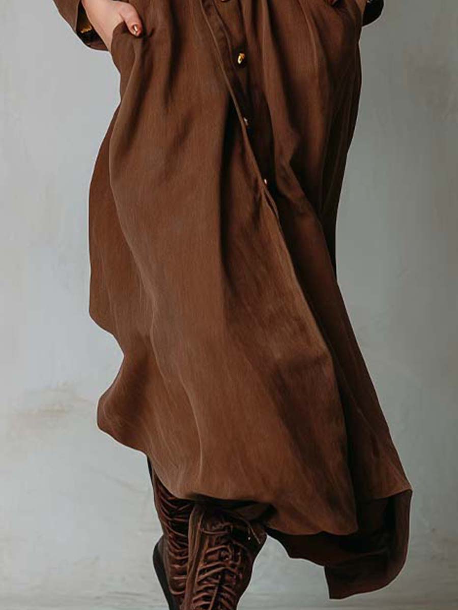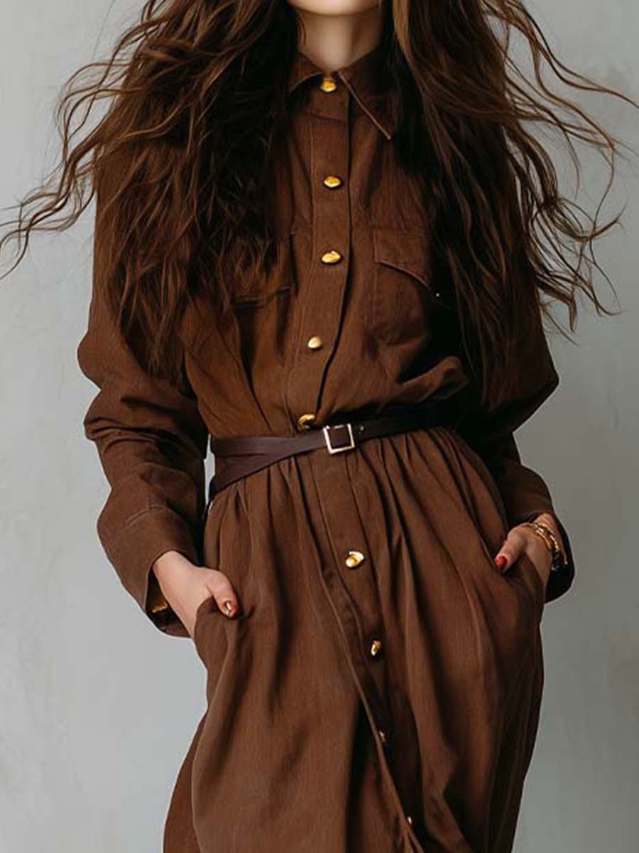 The Vintage Casual Cotton Reddish Brown Long Workwear Lapel Dress is a timeless piece that merges classic workwear aesthetics with a modern twist. Made from high-quality cotton, this dress offers both style and comfort, making it perfect for any casual outing or professional setting.