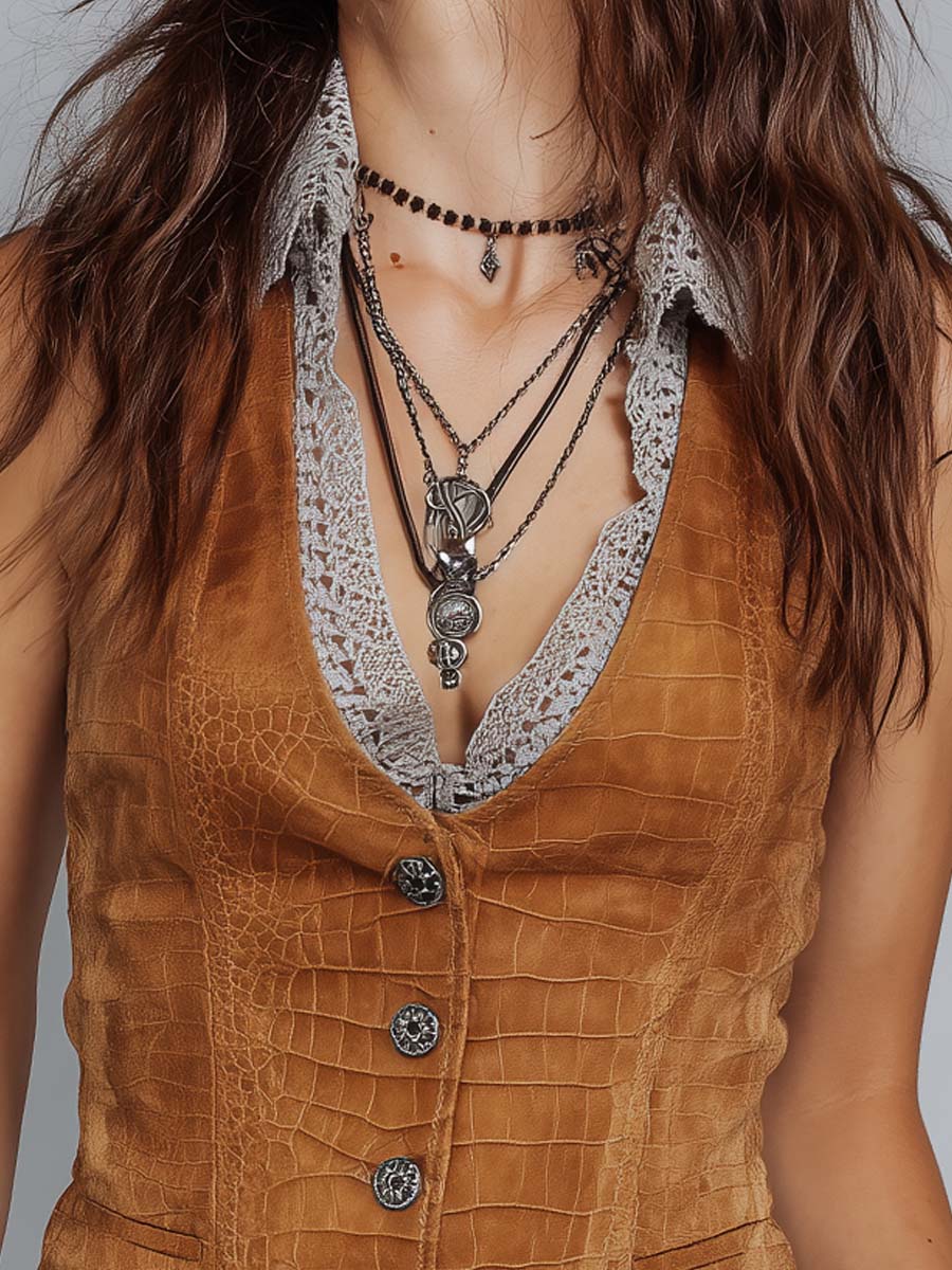 Introducing our Vintage Crocodile Texture Caramel Eco-suede Slim Fit Vest, an exquisite piece that combines timeless design with modern eco-friendly materials. The vest showcases a sophisticated crocodile texture in a rich caramel hue, offering both elegance and a touch of luxury to any outfit.