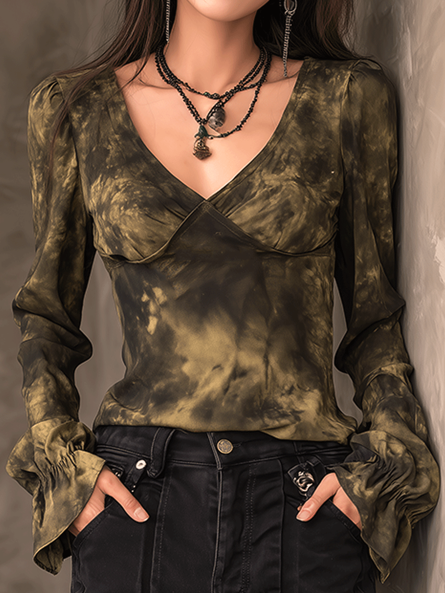 Vintage Dark Brown V-Neck Tie-Dye Trumpet Sleeve Top