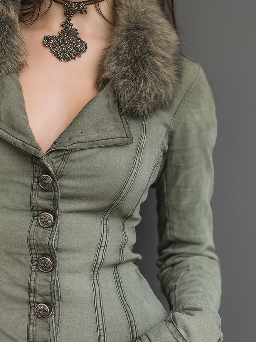 The Vintage Eco-friendly Fur Collar Distressed Slim-fit Jacket is the perfect blend of timeless style and modern sustainability. Ideal for those who want to make a fashion statement while prioritizing ethical choices. Elevate your wardrobe with this unique and versatile piece that promises both style and conscience.