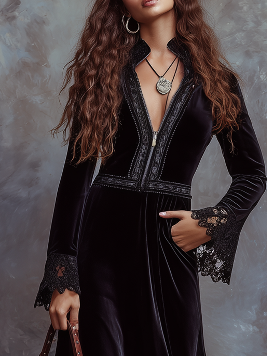 The Vintage Embroidered Trim Lace Cuffs Polyester Velvet Maxi Dress is a timeless addition to your wardrobe, offering both comfort and elegance. Its detailed design and luxurious fabric make it a standout choice for anyone looking to make a statement at their next special occasion.