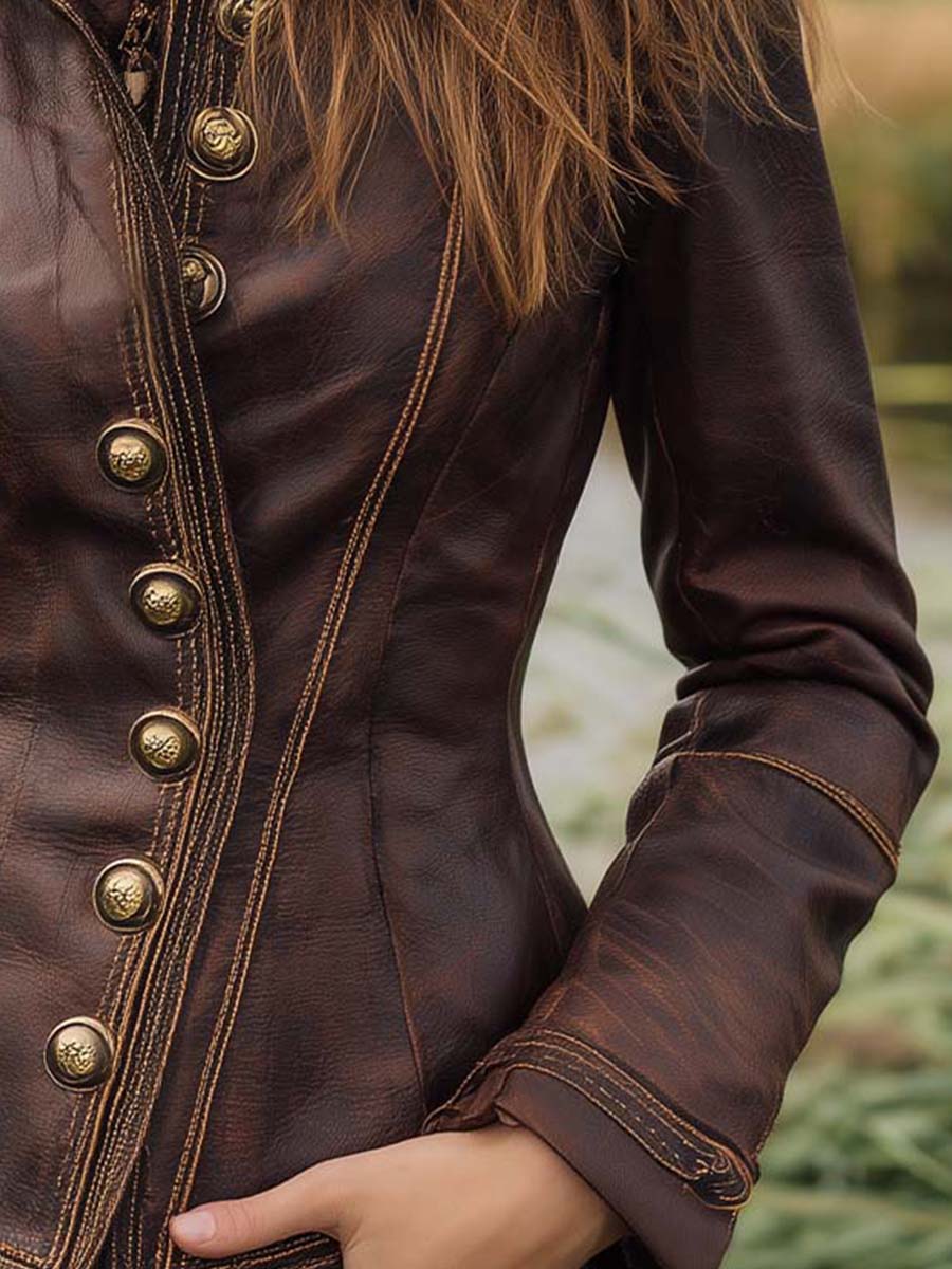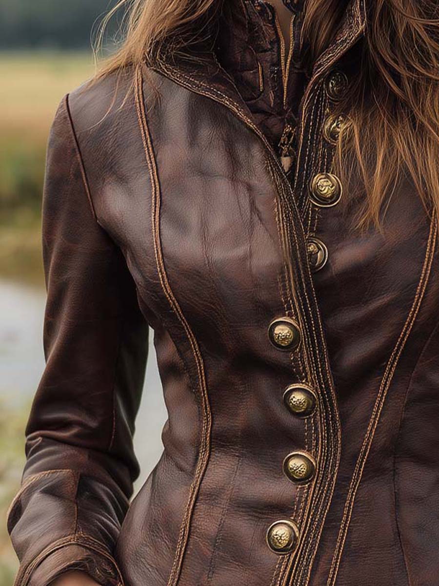 The Vintage Fitted Brown Leather Blazer with Contrast Stitching is an essential addition to any fashion-forward wardrobe. With its blend of classic elegance and contemporary style, it is suitable for both professional settings and casual outings. Elevate your fashion game with this versatile and chic blazer.