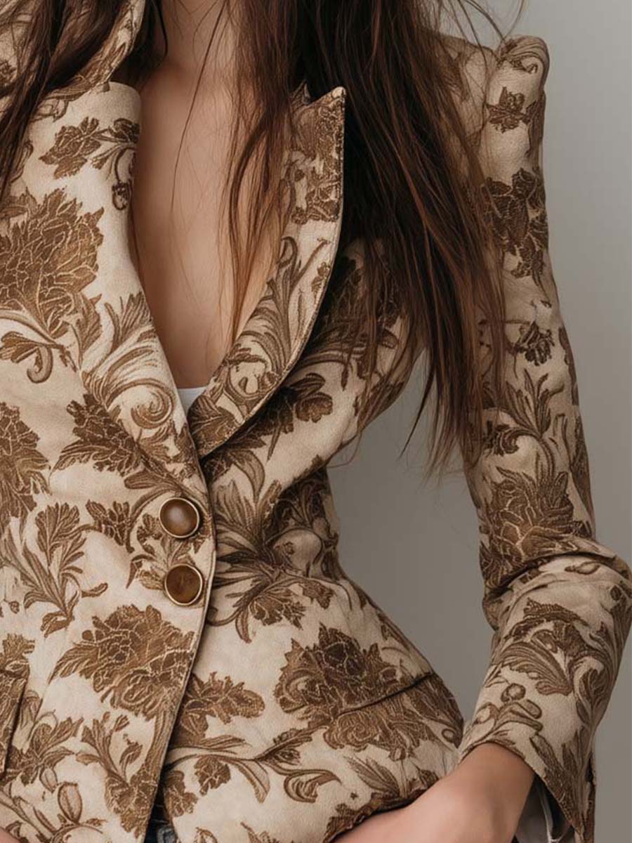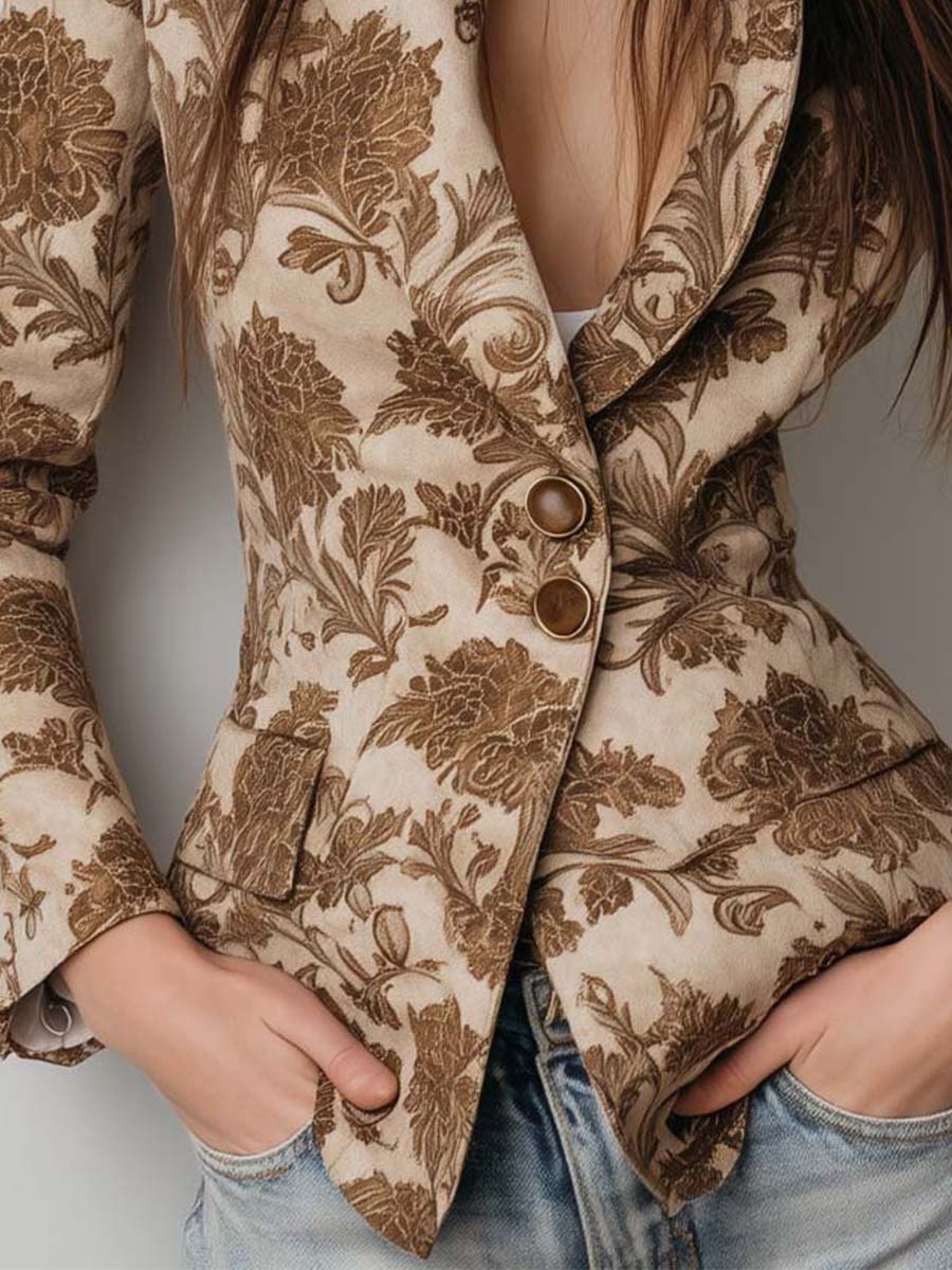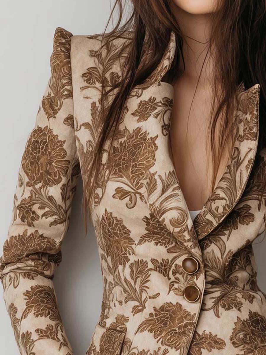 Vintage Floral Printed Eco-Suede Blazer – Sandstone Beige